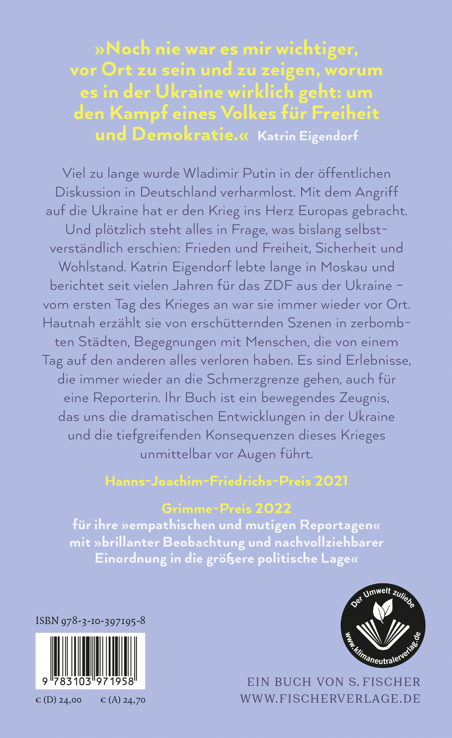 Katrin Eigendorf erzählt hier vom Krieg, den Putin mit aller Härte führt, vor allem gegen die Bevölkerung. Von ihren Begegnungen mit Menschen, die von einem Tag auf den anderen alles verloren haben, von Familien, die zerrissen wurden, von Kindern, die ihre Kindheit verloren haben. Es sind Begegnungen, die immer wieder an die Schmerzgrenze gehen, auch für eine Reporterin.
