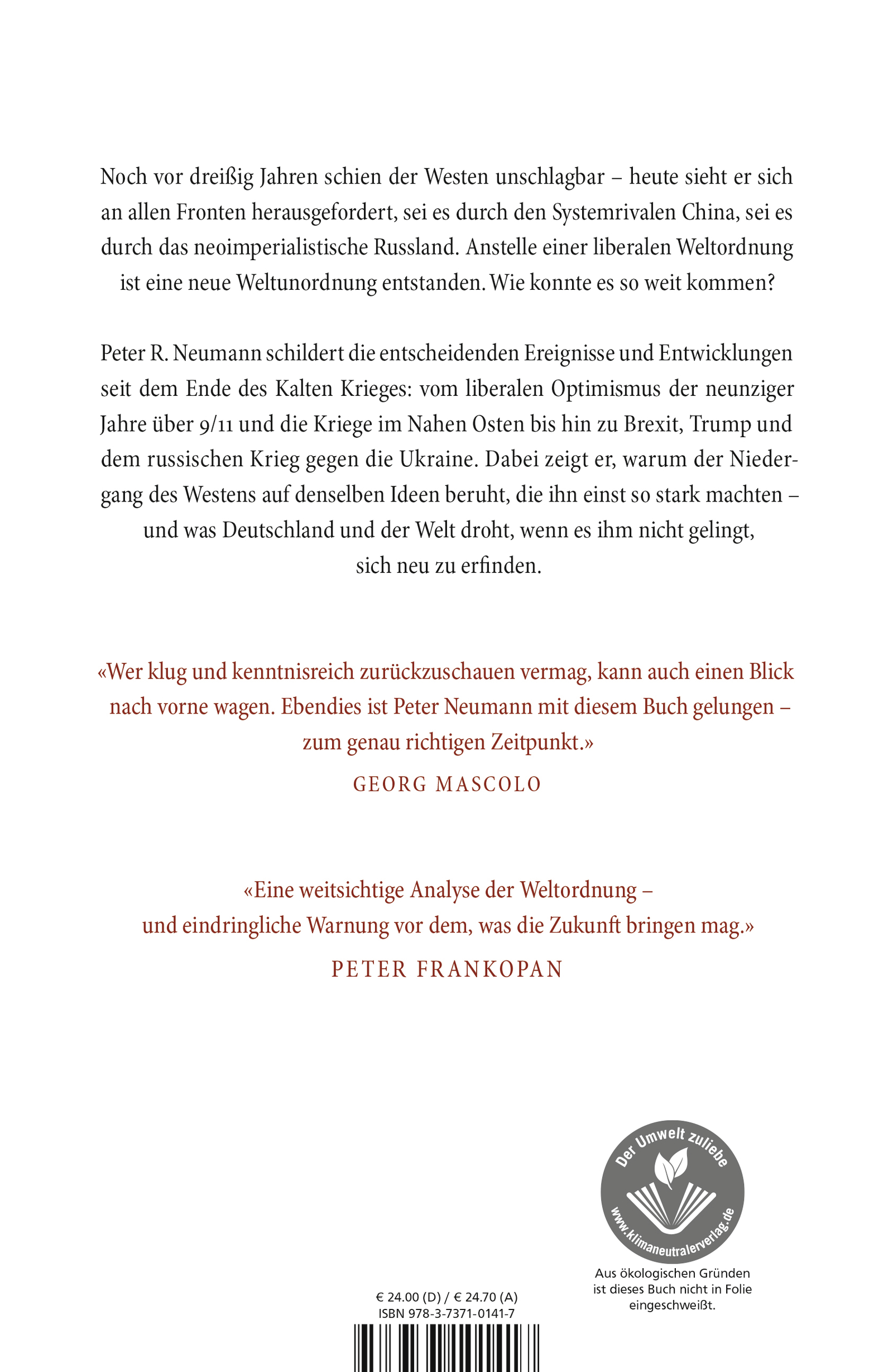 Peter R. Neumann, international gefragter Experte für Terrorismus und Geopolitik, zeigt, wie dies geschehen konnte und was jetzt passieren muss. Ein schonungsloser Blick auf die aktuelle Lage des Westens, der sich auf fatale Weise selbst überschätzt hat.