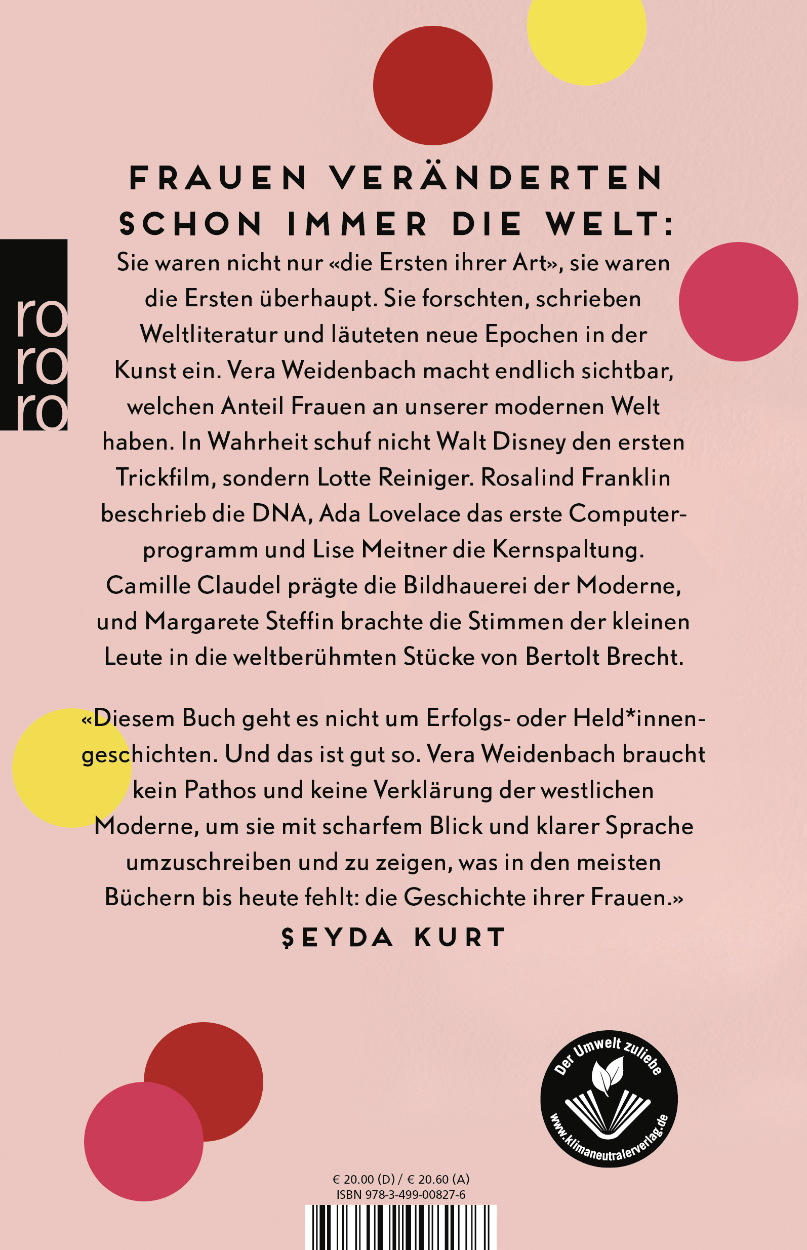 Sie waren nicht nur «die Ersten ihrer Art», sie waren die Ersten überhaupt. Sie forschten, schrieben Weltliteratur und läuteten neue Epochen in der Kunst ein. Vera Weidenbach macht endlich sichtbar, welchen Anteil Frauen an unserer modernen Welt haben. In Wahrheit schuf nicht Walt Disney den ersten Trickfilm, sondern Lotte Reiniger. Rosalind Franklin beschrieb die DNA, Ada Lovelace das erste Computerprogramm und Lise Meitner die Kernspaltung. Camille Claudel prägte die Bildhauerei der Moderne, und Margarete Steffin brachte die Stimmen der kleinen Leute in die weltberühmten Stücke von Bertolt Brecht.