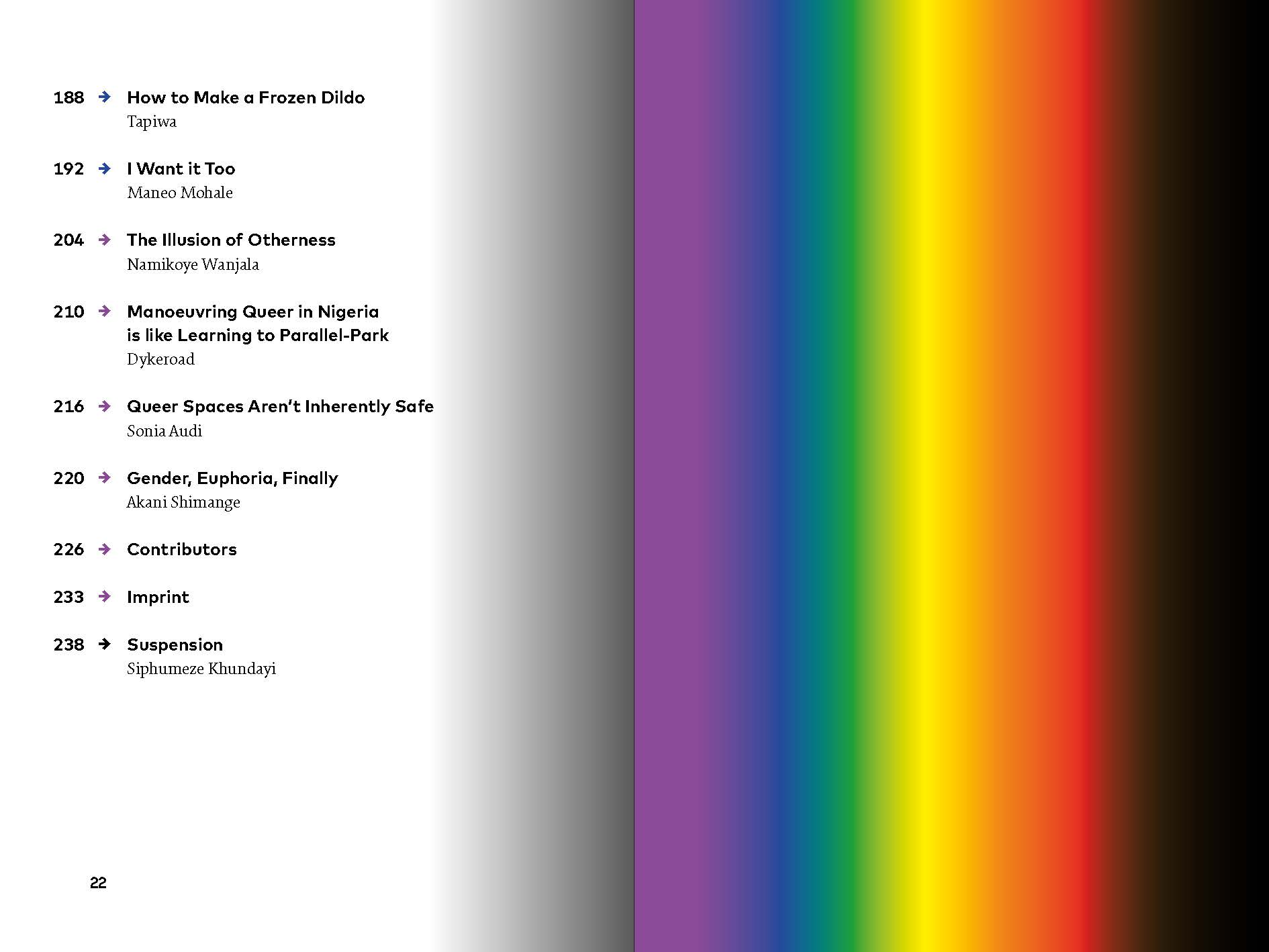 We are f*****g here! An African Queer Collection on Safer Sex, Sexuality and Gender is a portable rainbow. It’s an object and a portal, a spark of joy, beauty and sexiness when you need it. We are f*****g here! brings together issues of sexuality, pleasure and safety. Various contributors share their knowledge and experiences and affirm: We are. We are f*****g. And we are here.