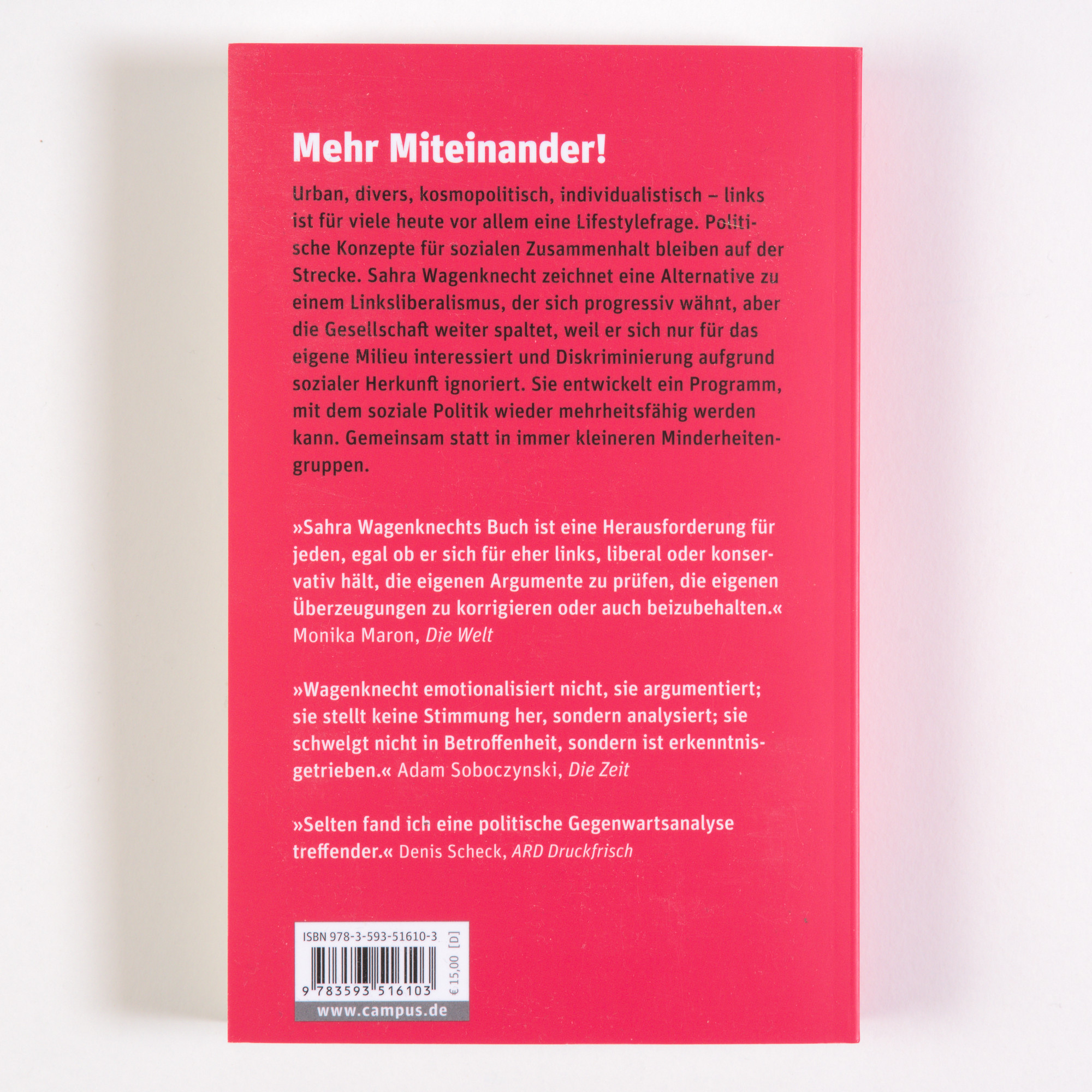 »Sahra Wagenknechts Buch ist eine Herausforderung für jeden, egal ob er sich für eher links, liberal oder konservativ hält, die eigenen Argumente zu prüfen, die eigenen Überzeugungen zu korrigieren oder auch beizubehalten.« Monika Maron, Die Welt, 13. April 2021»Wagenknecht hat ein Buch geschrieben, das sich mit großem Gewinn und viel Spaß lesen lässt, und das aufgrund seiner Klarheit auch von jenen Menschen verstanden werden kann, die kein sozial- oder geisteswissenschaftliches Studium absolviert haben, wie es sonst bei den meisten linken Diskursen der Fall ist.« Rainer Balcerowiak, Cicero Online, 14. April 2021»Das Skandalbuch der klugen Marxistin gegen die postmarxistische Lifestyle-Linke. Skandalös scharfsinnig!« Jens Jessen, Die ZEIT, 18.11.2021»Eine fulminante Abrechnung, die das ganze Gefüge der Gesellschaft betrifft.« Wolfgang Schütz, Augsburger Allgemeine, 14. April 2021»Wagenknecht emotionalisiert nicht, sie argumentiert; sie stellt keine Stimmung her, sondern analysiert; sie schwelgt nicht in Betroffenheit, sondern ist erkenntnisgetrieben.« Adam Soboczynski, Die Zeit, 15. April 2021»Ein grundlegendes gesellschaftstheoretisches Werk.« Tobias Becker, Der Spiegel, 16. April 2021»Wagenknecht hat ein Buch geschrieben, das in den analytischen Passagen überzeugt. Ihr "Gegenprogramm für Gemeinsinn und Zusammenhalt" sieht sie nicht als Gegenprogramm zum Wahlprogramm der Linken, sondern als Gegenprogramm zu einem Verständnis von linker Politik, das sie für falsch hält.« Hans Werner Kilz, Süddeutsche Zeitung, 17. April 2021»Wagenknechts Gegenprogramm ist für eine Wortführerin der Linken ziemlich spektakulär, aber auch ziemlich klar: Wir brauchen im Interesse gerade der unteren sozialen Hälfte der Bevölkerung in Deutschland eine Wiederbelebung der Solidarität mit dem eigenen Land.« Peter Gauweiler, Frankfurter Allgemeine Zeitung, 21. April 2021»Wagenknechts Buch ist [...] eine fundierte Gesamtbeschreibung und -analyse von allem, was in Amerika und Europa in den vergangenen Jahrzehnten wirtschaftlich, sozial und politisch schiefgelaufen ist. Es ist flüssig lesbar und gut strukturiert; es verzichtet auf polarisierende Polemik.« Wolfgang Pichler, General-Anzeiger Bonn, 24. April 2021»Funkelnde Formulierungen machen die Lektüre zu einem Genuss. (...) Die Selbstbewusste und Analysenstarke scheut weder "Beifall von der falschen Seite" noch Wut der Genossen.« Eckhard Jesse, Neue Zürcher Zeitung, 7. Mai 2021»Eine lesenswerte Analyse des Niedergangs der politischen Linken durch die Entfremdung von ihrer einstigen Wählerschaft.« Tim Herden, MDR, 23. Mai 2021»Selten fand ich eine politische Gegenwartsanalyse treffender.« Denis Scheck, ARD Druckfrisch, 12. September 2021
