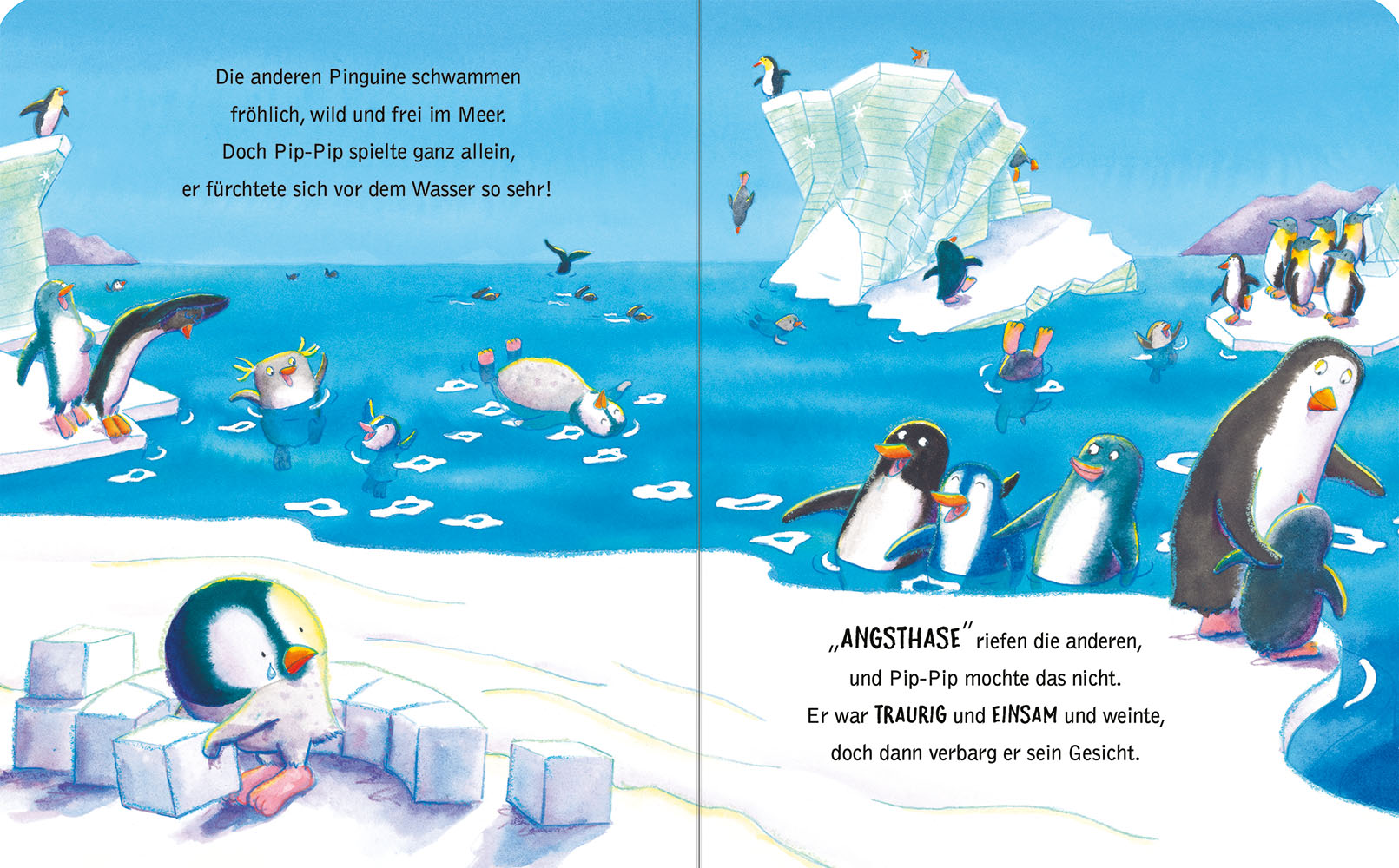 Der kleine Pip-Pip würde so gerne mit den anderen Pinguinen schwimmen. Aber da gibt es ein Problem: Er hat Angst vorm Wasser! Kann Pip-Pip seine Angst überwinden und schließlich den Sprung waren? Eine berührende Geschichte, die zeigt, dass wir manchmal einfach nur ein wenig liebevolle Unterstützung brauchen, um über unseren eigenen Schatten zu springen.