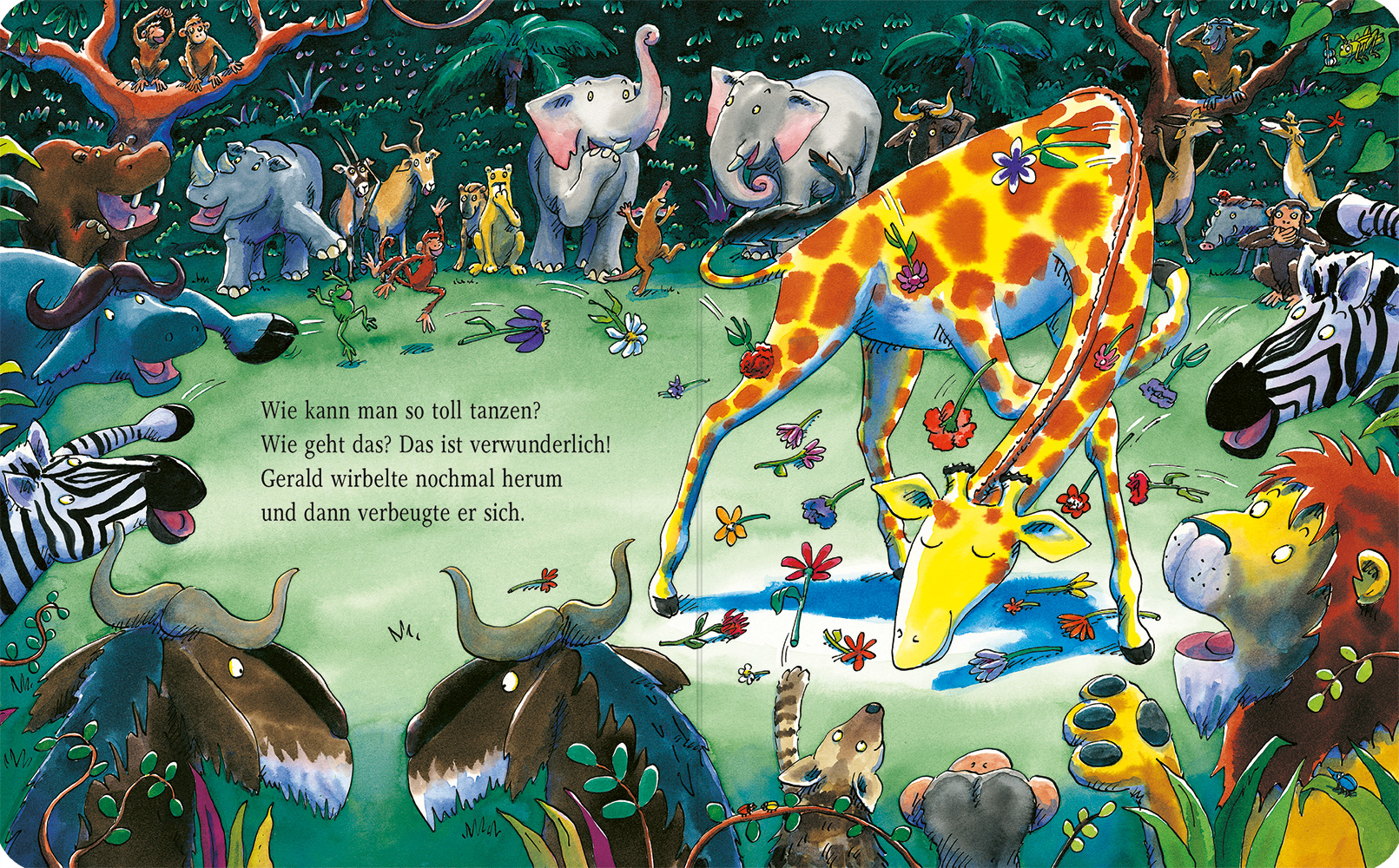 Gerald war eine große Giraffe, sein Hals war lang und schmal. Die Knie waren ziemlich krumm und die Beine dünn, so war's nun mal.Gerald würde so gerne zusammen mit den anderen Tieren beim Dschungeltanz mitmachen, aber jeder weiß, dass Giraffen nicht tanzen können, ... oder? Am Abend des Tanzfests haben alle Tiere ihren großen Auftritt. Als Gerald an der Reihe ist, wird er von allen ausgelacht. Traurig und einsam geht er nach Hause. Aber da hat er eine unerwartete Begegnung. Vielleicht wird doch noch alles gut?
