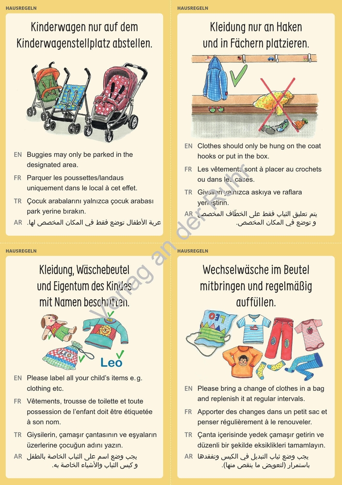 Mehrsprachige Bildkarten für multikulturelle Elterngespräche in der Kita +++ Die (Sprachen-)Vielfalt in der Kita stellt Erzieher und Erzieherinnen im Alltag regelmäßig vor besondere Herausforderungen in der Elternkommunikation: Wie führt man ein Elterngespräch, wenn es keine gemeinsame Sprache zur Verständigung gibt und auch kein Dolmetscher und keine Dolmetscherin einbezogen werden können? Wo Worte fehlen, helfen Bilder - dies ist die Idee dieser mehrsprachig übersetzten Bildkarten, die Sie in Elterngesprächen mit nicht deutschsprachigen Eltern als visualisierte Verständigungshilfe einsetzen können. Abgestimmt auf die Themeninhalte von Entwicklungs- und Kennenlerngesprächen, bietet Ihnen dieses Material Bildvorlagen mit Textbausteinen in den Sprachen Türkisch, Arabisch, Englisch und Französisch. Darüber hinaus finden Sie im Kartenset auch wichtige Themen aus dem Kita-Alltag, wie Tagesablauf, Hausregeln, Rituale, Festlichkeiten im Kita-Jahr, sowie Empfehlungen für eine gelingende Erziehungspartnerschaft. Didaktische Tipps zum praktischen Einsatz der Karten, eine Liste relevanter Sätze in den verschiedenen Sprachen für das Drumherum eines herzlichen Gesprächs sowie nützliche Hintergrundinformationen zu Kultur und Kita-System der Herkunftsländer finden Sie in einem umfangreichen Begleitheft.