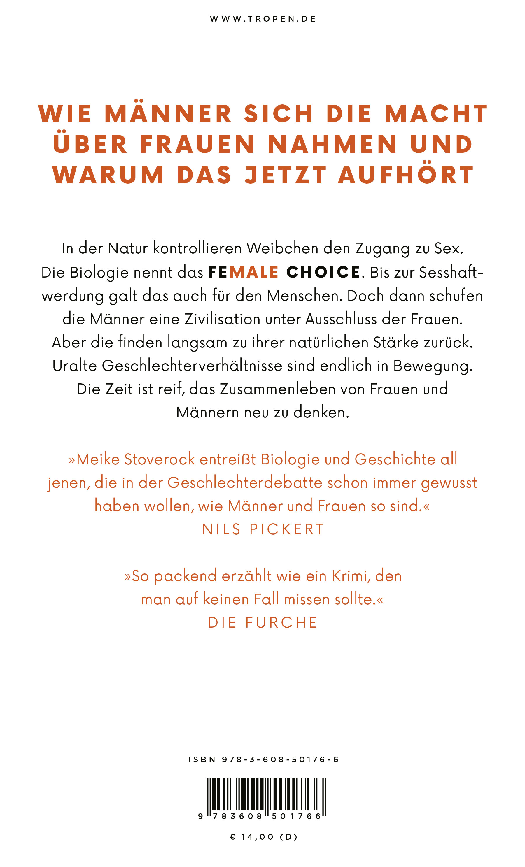 FEMALE CHOICE ist ein Fachterminus aus der Biologie, der die Fortpflanzungsstrategie der allermeisten Lebewesen beschreibt. Hierbei müssen Männchen eine Leistung erbringen, um sich mit einem Weibchen zu paaren. Denn für das Weibchen ist Fortpflanzung viel aufwändiger. Sie ist wählerisch, er anspruchslos. Er geht auf Masse, sie auf Klasse. Er konkurriert, sie entscheidet. Doch im Laufe der Geschichte unserer Zivilisation hatten die Frauen bisher kaum eine Wahl. Mit der Landwirtschaft wurden die Menschen sesshaft und die Frauen aus der Öffentlichkeit ins private Heim gedrängt. Erst seit – evolutionsbiologisch – sehr kurzer Zeit können Frauen die Welt mitgestalten. Und nun gerät die männliche Ordnung ins Wanken. Überall formiert sich männlicher, zum Teil gewaltbereiter Widerstand. Was nun? Klug, provokant und anschaulich beschreibt Meike Stoverock nicht nur, wo die Menschheit vor über 10 000 Jahren falsch abgebogen ist, sondern auch, was sich ändern muss, damit Männer und Frauen eine gemeinsame Zukunft haben.