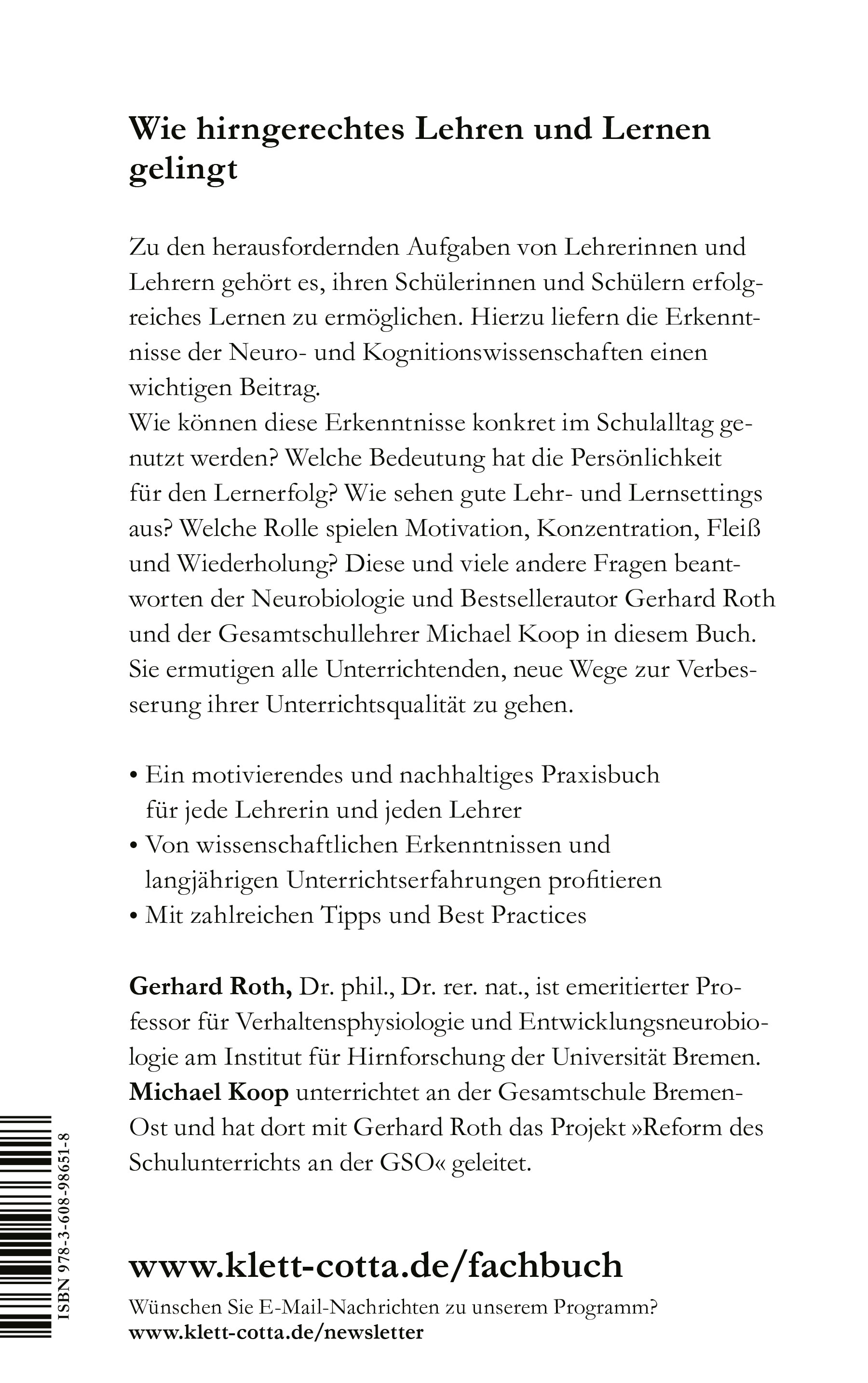 | Schlagworte | Hirnforschung • Lehren • Lerncoaching • Lernen • Lernerfolg • Lernhilfe • Lernprobleme • Motivation • Pädagogik • Schule • Schulunterricht • Unterrichtsplanung • Unterrichtsratgeber |