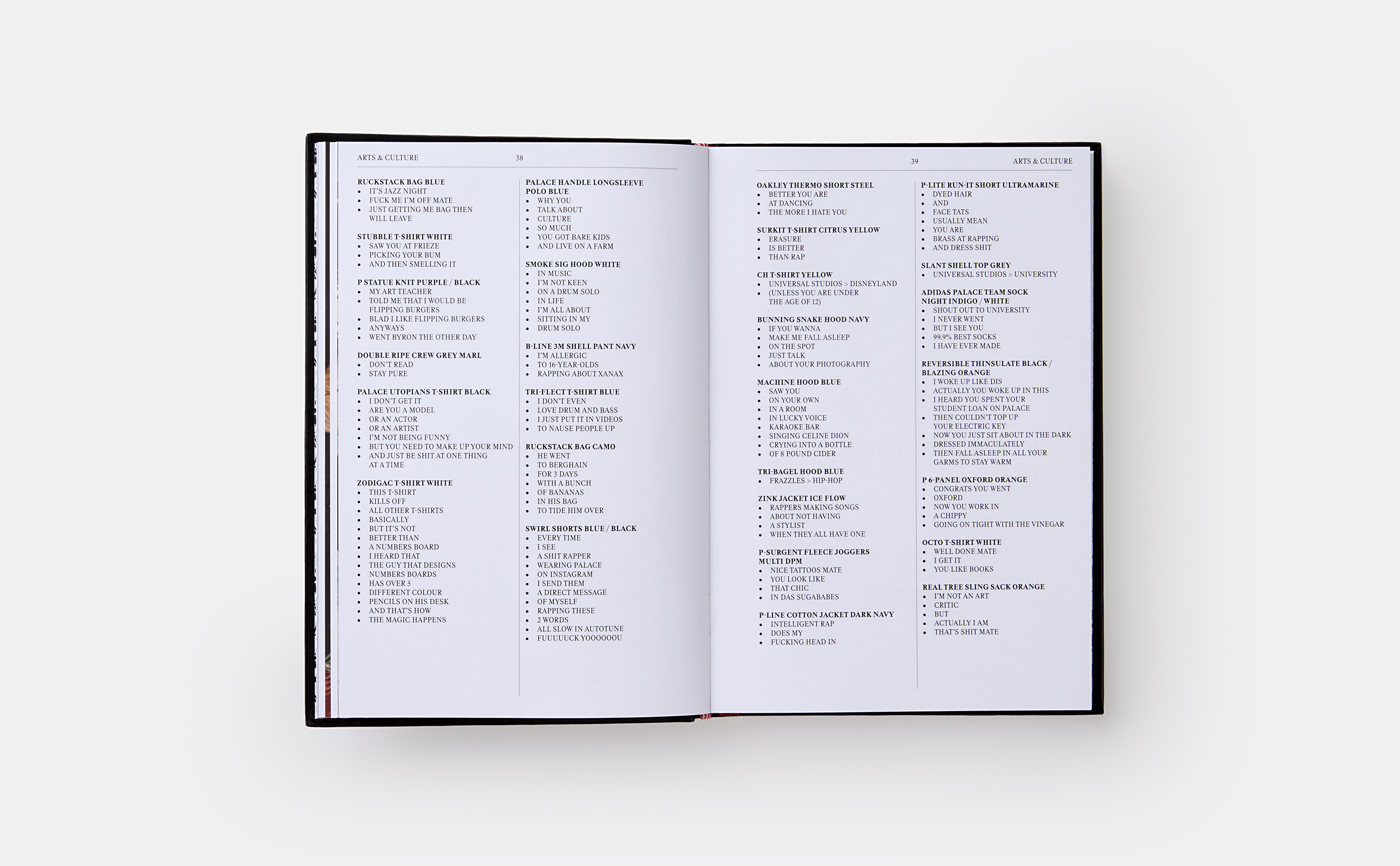 Collected here for the first time and printed as they appear online - a few lines set in all caps, formatted as a series of bullet points – the more than 3,000 descriptions are organised into 22 tongue-in-cheek categories, including Anatomy, Animals, Etiquette, Philanthropy, Romance and Travel. The text is interspersed with shots of highly coveted Palace products and chapter openers feature candid, behind-the-scenes images from Palace's archive.