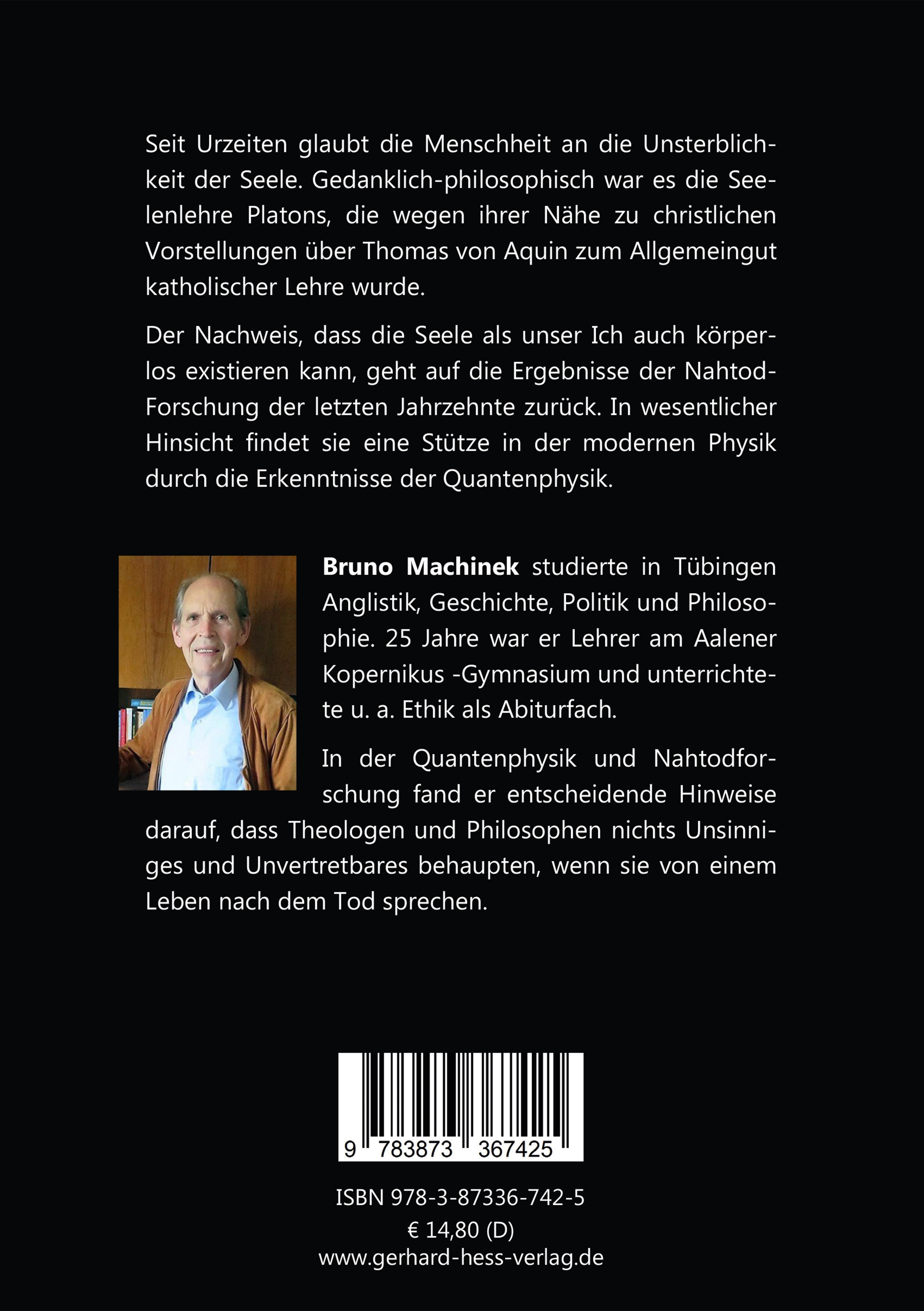 Seit Urzeiten glaubt die Menschheit an die Unsterblichkeit der Seele. Gedanklich-philosophisch war es die Seelenlehre Platons, die wegen ihrer Nähe zu christlichen Vorstellungen über Thomas von Aquin zum Allgemeingut katholischer Lehre wurde. Der Nachweis, dass die Seele als unser Ich auch körperlosexistieren kann, geht auf die Ergebnisse der Nahtod-Forschung der letzten Jahrzehnte zurück. In wesentlicher Hinsicht findet sie eine Stütze in der modernen Physik durch die Erkenntnisse der Quantenphysik. Bruno Machinek studierte in Tübingen Anglistik, Geschichte, Politik und Philosophie. 25 Jahre war er Lehrer am Aalener Kopernikus -Gymnasium und unterrichtete u. a. Ethik als Abiturfach. In der Quantenphysik und Nahtodforschung fand er entscheidende Hinweise darauf, dass Theologen und Philosophen nichts Unsinniges und Unvertretbares behaupten, wenn sie von einem Leben nach dem Tod sprechen.