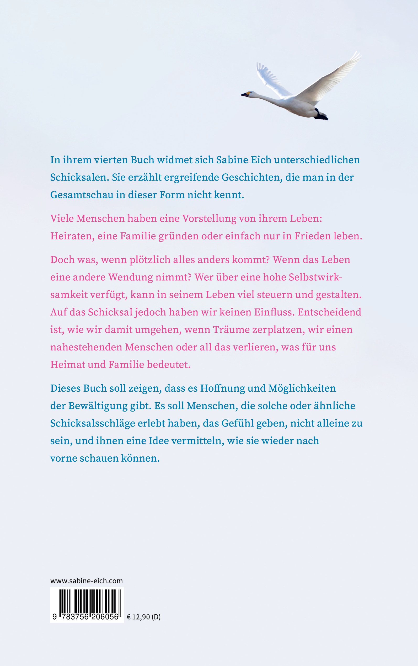 Sabine Eich, Heilpraktikerin für Psychotherapie, arbeitet als Sport-Mentaltrainerin und Coach in eigener Praxis. Ihre fundierte Coachingausbildung absolvierte sie am Milton-Erickson-Institut in Bonn und bedarf einer lösungs- und ressourcenorientierte Haltung und Arbeit. Ihr Angebotsspektrum umfasst Einzelcoachings, Teamentwicklung, Businesscoachings sowie Vorträge und Workshops. Ihrer Überzeugung nach gilt es, die Leistung der Menschen in heraufordernden Situationen zu würdigen und als Ressourcen zu sehen. Seit über zehn Jahren begleitet sie erfolgreich Sportler, Trainer und Teams im mentalen Trainingsbereich sowie Menschen in ihren alltäglichen und beruflichen Herausforderungen. Ein Schwerpunkt ihrer Arbeit stellt die Erstellung von Konzepten zur zielgenauen Durchführung verschiedener Trainings und Maßnahmen in Sport und Business dar. Wie schaffen es Menschen, nach und mit Schicksalsschlägen weiterzuleben? Diese Frage führte sie zu der Idee ihres mittlerweile vierten Buches.