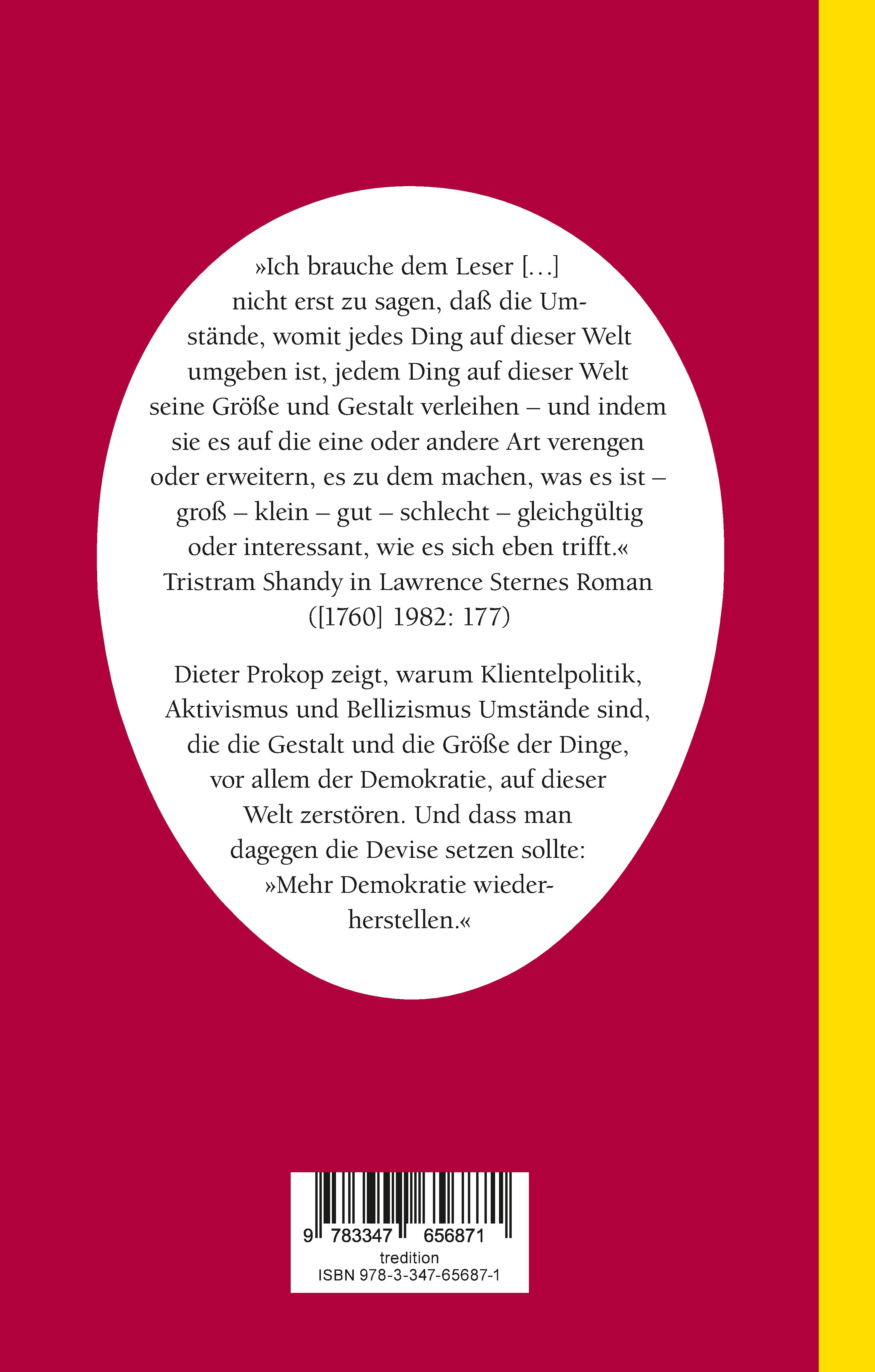 (Auszug aus dem Buch:) Der Räuber Moor als "Bevollmächtigter des Weltgerichts" - und der bescheidenere Tristram Shandy, Gentleman: Die ganze Welt moralisch im Blick hat bei Friedrich Schiller der stark idealisierte Räuber Moor, der sich selbst als "Bevollmächtigter des Weltgerichts" sieht. (Die Räuber [1800] 2009: 283, 5. Aufz., 6. Auftr. 20. Zeile) Da muss es immer die ganze Welt sein. - Wie bescheiden ist dagegen bei Lawrence Sterne der "Wichtigkeitskreis" des Tristram Shandy. Er ist auf 4 bis 5 Meilen Umfang beschränkt: "So daß nicht nur das ganze Kirchspiel, sondern auch noch 2-3 Meilen innerhalb der Grenzen des anstoßenden Sprengels mit einbegriffen waren [...]." ([1760-67] 1982: 56, 13. Kap.) Deshalb kann der nüchterne Tristram auch in aller Bescheidenheit feststellen: "Es ist ein besonderer Segen, daß die Natur des Menschen das Gemüt des Menschen mit derselben glücklichen Abgeneigtheit und Widerspenstigkeit gegen Überzeugung ausgestattet [hat], wie man an alten Hunden bemerkt, - daß sie keine neuen Kunststücke mehr lernen wollen." (A.a.O.; 240, 34. Kap,) Dem Räuber Moor ist diese glückliche Abgeneigtheit und Widerspenstigkeit gegen Überzeugung nicht gegeben. - Den Räuber*innen Moor bis heute nicht.