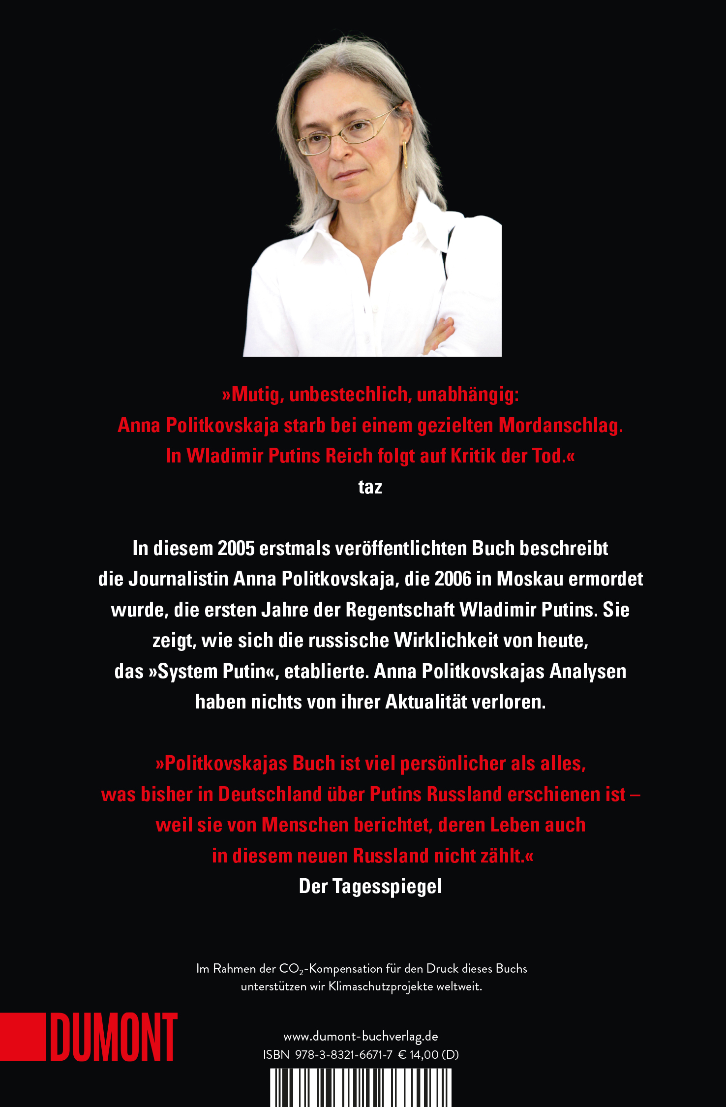 ANNA POLITKOVSKAJA wurde 1958 in New York geboren und 2006 in Moskau ermordet. Sie war die international bekannteste russische Journalistin, mit ihren Berichten über Tschetschenien erlangte sie Berühmtheit und wurde mit zahlreichen Preisen geehrt. Sie arbeitete für die Moskauer Zeitung ›Novaja Gazeta‹. Am 7. Oktober 2006 wurde Anna Politkovskaja im Aufzug ihres Wohnhauses in der Moskauer Lesnaja-Straße durch mehrere Schüsse getötet. Im DuMont Buchverlag erschien 2003 ihre Dokumentation ›Tschetsc