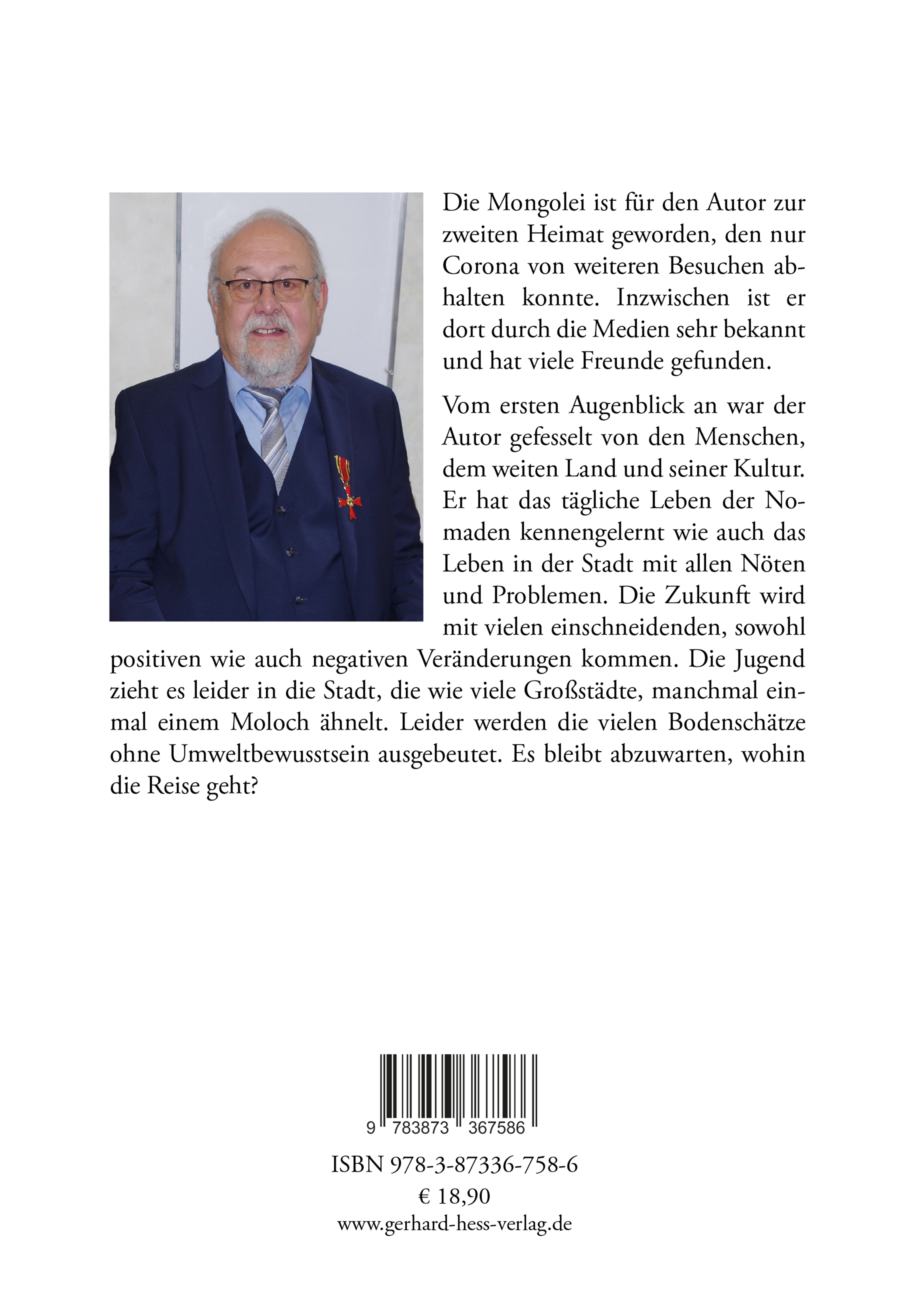 Die Mongolei ist für den Autor zur zweiten Heimat geworden, den nur Corona von weiteren Besuchen abhalten konnte. Inzwischen ist er dort durch die Medien sehr bekannt und hat viele Freunde gefunden. Vom ersten Augenblick an war der Autor gefesselt von den Menschen, dem weiten Land und seiner Kultur. Er hat das tägliche Leben der Nomaden kennengelernt wie auch das Leben in der Stadt mit allen Nöten und Problemen. Die Zukunft wird mit vielen einschneidenden, sowohl positiven wie auch negativen Veränderungen kommen. Die Jugend zieht es leider in die Stadt, die wie viele Großstädte, manchmal einmal einem Moloch ähnelt. Leider werden die vielen Bodenschätze ohne Umweltbewusstsein ausgebeutet. Es bleibt abzuwarten, wohin die Reise geht? Manfred Haas, Jahrgang 1950, geboren und aufgewachsen in Neubrunn bei Würzburg/Ufr., erlernte zunächst in einer Fachschule das Handwerk eines Maschinenbauers. Nach mehrjähriger Berufserfahrung sattelte er um in die Elektrotechnik, der er auch treu blieb bis zum Ende seines Berufslebens. Ab 1982 arbeitete er zunächst in der Schwachstromabteilung des staatlichen Luitpoldkrankenhauses in Würzburg um dann die Leitung der Elektronikwerkstatt der HNO zu übernehmen. Seine Hobbys waren die Elektronik und Fernreisen in alle Welt. Im Jahr 1992 lernte er im Krankenhaus seinen späteren Freund Prof. Bat Erdenechuluun aus Ulan Bator/Mongolei kennen. Hieraus entstand eine innige Freundschaft, der die hier im Buch aufgeführten Tätigkeiten und Reisen folgten.