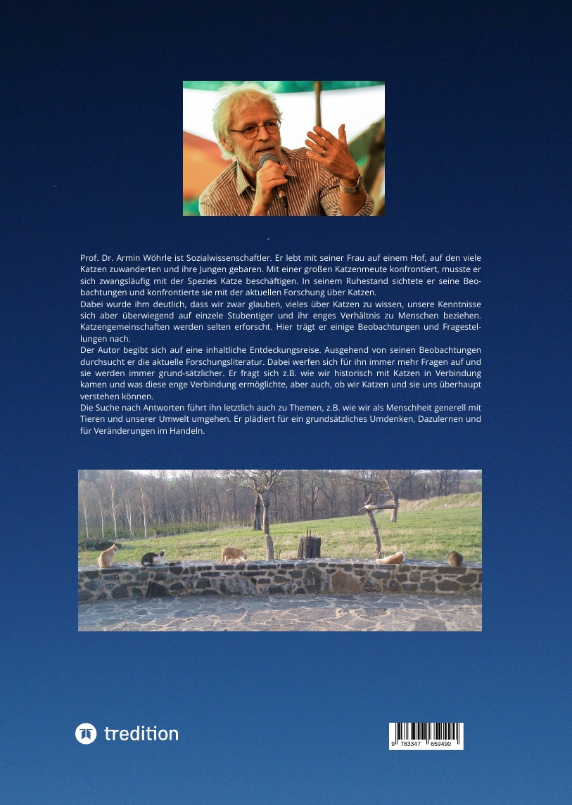 Prof. Dr. Armin Wöhrle ist Sozialwissenschaftler. Er lebt mit seiner Frau auf einem Hof, auf den viele Katzen zuwanderten und ihre Jungen gebaren. Mit einer großen Katzenmeute konfrontiert musste er sich zwangsläufig mit Katzen beschäftigen. In seinem Ruhestand sichtete er seine Beobachtungen und konfrontierte sie mit der aktuellen Forschung über Katzen. Dabei wurde ihm deutlich, dass wir zwar glauben vieles über Katzen zu wissen, unsere Kenntnisse sich aber überwiegend auf einzelne Stubentiger und ihr enges Verhältnis zu uns Menschen beziehen. Katzengemeinschaften werden seltener erforscht. Damit fehlen uns wichtige Erkenntnisse über das Sozialverhalten von Katzen. Hier trägt er einige Beobachtungen und Fragestellungen nach.Der Autor begibt sich in diesem Buch auf eine inhaltliche Entdeckungsreise. Ausgehend von seinen Beobachtungen und den daraus entstehenden Fragen durchsucht er die aktuelle Forschungsliteratur. Dabei werfen sich für ihn immer mehr Fragen auf und sie werden immer grundsätzlicher. Er fragt sich z.B., wie wir historisch mit Katzen in Verbindung kamen und was die enge Verbindung ermöglichte, aber auch, ob wie Katzen und sie uns überhaupt verstehen können. Die Suche nach Antworten auf diese Fragen führt ihn letztlich auch zu den Themen, wie wir als Menschheit generell mit Tieren und unserer Umwelt umgehen. Er plädiert dafür, dass wir grundsätzlich umdenken müssen.