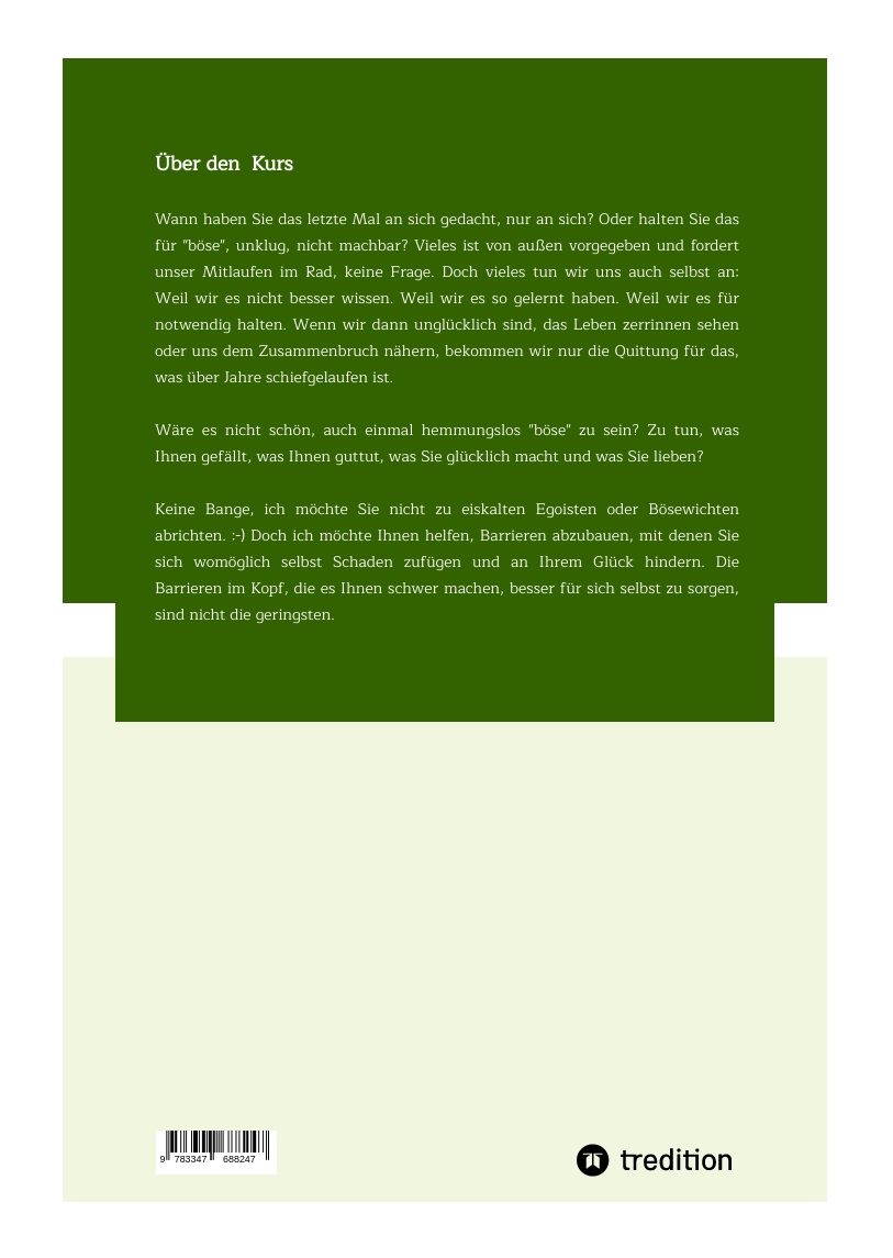 Wann haben Sie das letzte Mal an sich gedacht, nur an sich? Oder halten Sie das für "böse", unklug, nicht machbar? Vieles ist von außen vorgegeben und fordert unser Mitlaufen im Rad, keine Frage. Doch vieles tun wir uns auch selbst an: Weil wir es nicht besser wissen. Weil wir es so gelernt haben. Weil wir es für notwendig halten. Wenn wir dann unglücklich sind, das Leben zerrinnen sehen oder uns dem Zusammenbruch nähern, bekommen wir nur die Quittung für das, was über Jahre schiefgelaufen ist.Wäre es nicht schön, auch einmal hemmungslos "böse" zu sein? Zu tun, was Ihnen gefällt, was Ihnen guttut, was Sie glücklich macht und was Sie lieben?Keine Bange, ich möchte Sie nicht zu eiskalten Egoisten oder Bösewichten abrichten. :-) Doch ich möchte Ihnen helfen, Barrieren abzubauen, mit denen Sie sich womöglich selbst Schaden zufügen und an Ihrem Glück hindern. Die Barrieren im Kopf, die es Ihnen schwer machen, besser für sich selbst zu sorgen, sind nicht die geringsten.Was werden Sie in diesem Selbstlernkurs lernen? 1. Wenn es nicht mehr geht: Was macht Sie unglücklich, traurig, wütend oder krank? Sie erkennen, welche Bedürfnisse nicht erfüllt und welche Grenzen verletzt werden. 2. Wie konnte es so weit kommen: Warum tun Sie sich das an? Sie erkennen, wie scheinbare und tatsächliche Sachzwänge, Ängste, Sorgen und Befürchtungen, äußere Vorgaben, Muster und Erfahrungen sowie innere Werte, Einstellungen und Wünsche sich negativ auswirken, Sie zu viel kosten oder Ihnen Schaden zufügen. * Für Hochsensible: Wie kann Ihnen Ihre hohe Empfindsamkeit Schaden zufügen? 3. Was kann man dagegen tun: Sie lernen das Medikament "böse sein" kennen. * Abwerfen: Was dürfte und sollte verschwinden, damit es Ihnen besser geht? Energieräuber dingfest machen, Lasten verringern und loslassen lernen. * Abändern: Was müsste und sollte anders laufen, damit es Ihnen besser geht? Gewohnheiten ändern, Grenzen setzen und eigene Bedürfnisse verwirklichen. * Antasten: Welche Werte und Muster sollten Sie wie ersetzen, damit es Ihnen besser geht? Das "Böse" zulassen lernen und nach neuen Wegen für alte Probleme suchen. * Für Hochsensible: Wie können Sie offen für andere bleiben und doch besser für sich sorgen? 4. "Böse" sein und "böse" bleiben: Sie sammeln Anregungen, wie Sie auch im Alltag Ihre Interessen und Ihr Wohl im Auge behalten und Selbstschädigendes meiden.