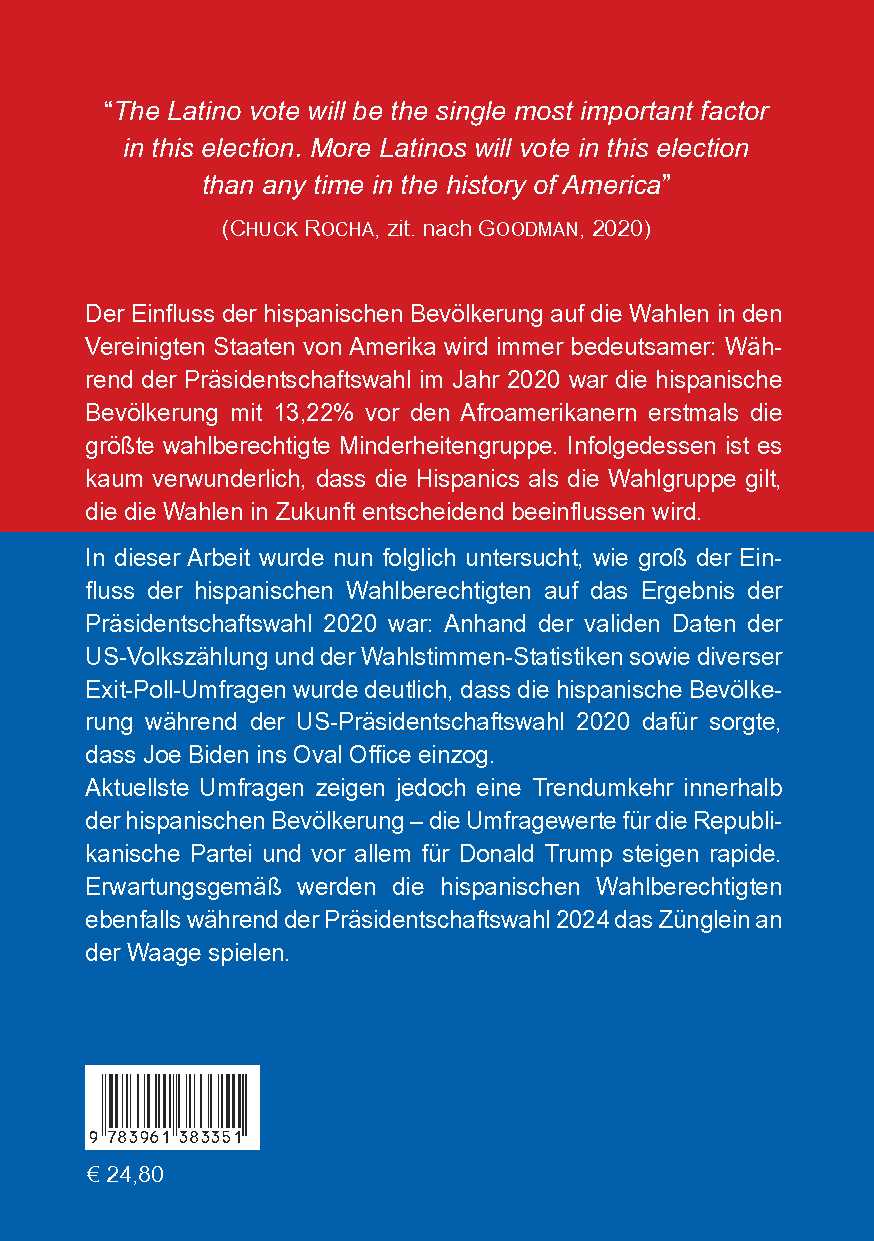 Der Einfluss der hispanischen Bevölkerung auf die Wahlen in den Vereinigten Staaten von Amerika wird immer bedeutsamer: Während der Präsidentschaftswahl im Jahr 2020 war die hispanische Bevölkerung mit 13,22% vor den Afroamerikanern erstmals die größte wahlberechtigte Minderheitengruppe. Infolgedessen ist es kaum verwunderlich, dass die Hispanics als die Wahlgruppe gilt, die die Wahlen in Zukunft entscheidend beeinflussen wird.