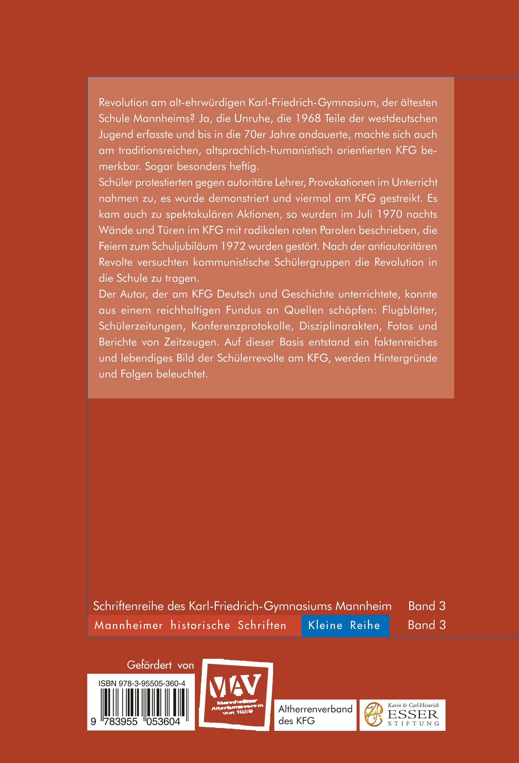 Revolution am alt-ehrwürdigen Karl-Friedrich-Gymnasium, der ältesten Schule Mannheims? Ja, die Unruhe, die 1968 Teile der westdeutschen Jugend erfasste und bis in die 70er Jahre andauerte, machte sich auch am traditionsreichen, altsprachlich-humanistisch orientierten KFG bemerkbar. Sogar besonders heftig. Schüler protestierten gegen autoritäre Lehrer, Provokationen im Unterricht nahmen zu, es wurde demonstriert und viermal am KFG gestreikt. Es kam auch zu spektakulären Aktionen, so wurden im Juli 1970 nachts Wände und Türen im KFG mit radikalen roten Parolen beschrieben, die Feiern zum Schuljubiläum 1972 wurden gestört. Nach der antiautoritären Revolte versuchten kommunistische Schülergruppen die Revolution in die Schule zu tragen.Der Autor, der am KFG Deutsch und Geschichte unterrichtete, konnte aus einem reichhaltigen Fundus an Quellen schöpfen: Flugblätter, Schülerzeitungen, Konferenzprotokolle, Disziplinarakten, Fotos und Berichte von Zeitzeugen. Auf dieser Basis entstand ein faktenreiches und lebendiges Bild der Schülerrevolte am KFG, werden Hintergründe und Folgen beleuchtet.