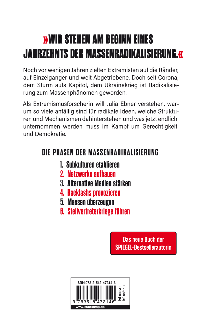 Noch vor wenigen Jahren zielten Extremisten auf den Rand, auf Einzelgänger und weit Abgetriebene. Doch seit Corona, dem Sturm aufs Kapitol, dem Ukraine-Krieg ist Radikalisierung zum Massenphänomen geworden. Als Extremismusforscherin will Julia Ebner verstehen, warum so viele anfällig sind für radikale Ideen, welche Strukturen und Mechanismen dahinterstehen und was jetzt endlich unternommen werden muss im Kampf um Gerechtigkeit und Demokratie.
