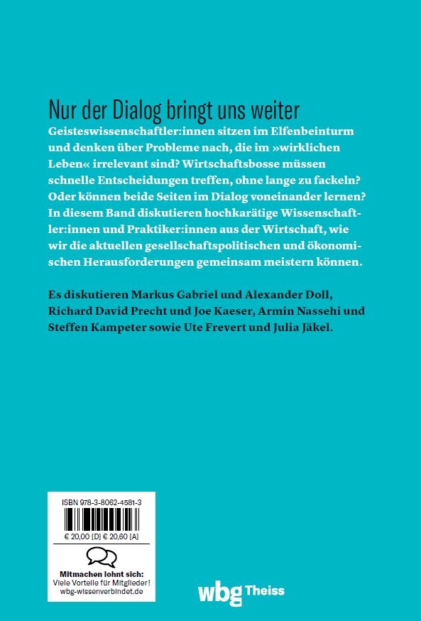 Geisteswissenschaftler:innen sitzen im Elfenbeinturm und denken über Probleme nach, die im »wirklichen Leben« irrelevant sind? Wirtschaftsbosse müssen schnelle Entscheidungen treffen, ohne lange zu fackeln? Oder können beide Seiten im Dialog voneinander lernen? In diesem Band diskutieren hochkarätige Wissenschaftler:innen und Praktiker:innen aus der Wirtschaft, wie wir die gesellschaftspolitischen und ökonomischen Herausforderungen, die sich durch die Corona-Pandemie und den Angriffskrieg auf die Ukraine noch einmal deutlich verschärft haben, gemeinsam meistern können. Dabei geht es um Freiheit und globalen Wettbewerb, Digitalisierung, die Relevanz von Geisteswissenschaften, die Rolle von Kultur und Religion und Bildung sowie darum, welche Werte Wirtschaft und Gesellschaft heute brauchen.
