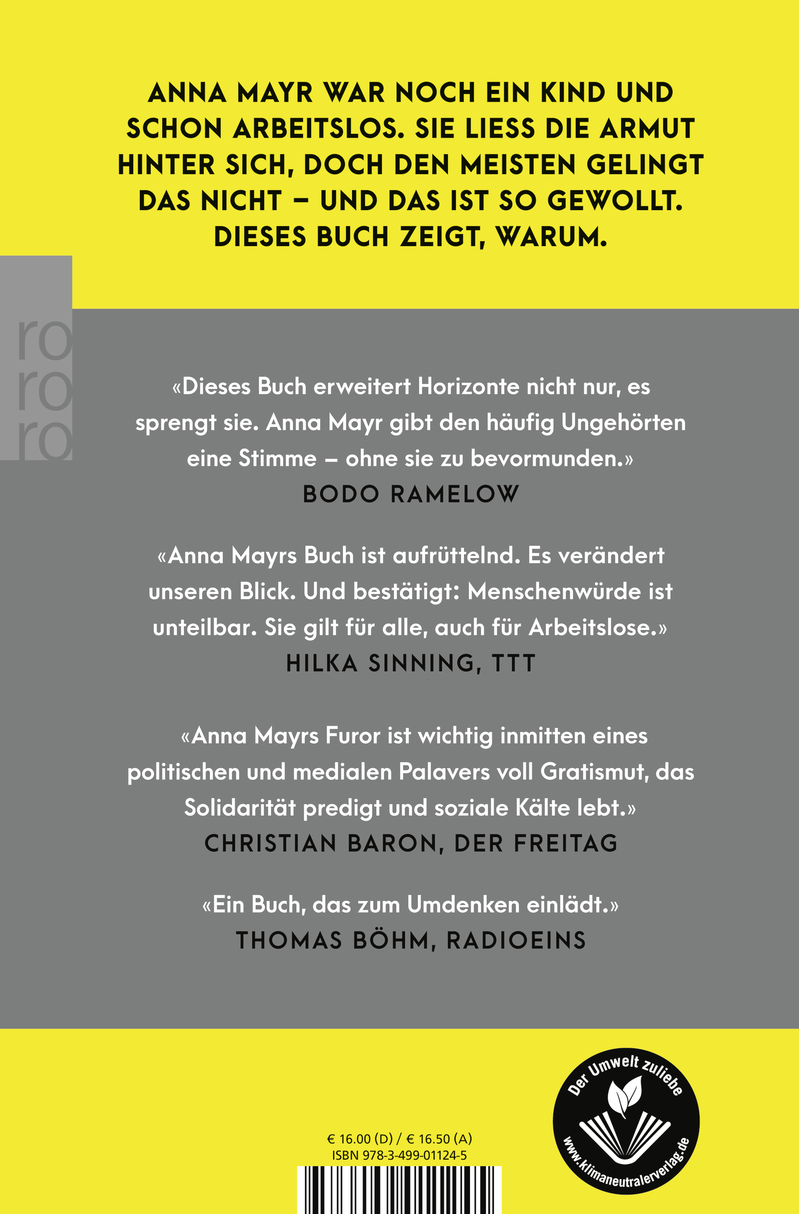 Faul. Ungebildet. Desinteressiert. Selber schuld. Als Kind von zwei Langzeitarbeitslosen weiß Anna Mayr, wie falsch solche Vorurteile sind – was sie nicht davor schützte, dass ein Leben auf Hartz IV ein Leben mit Geldsorgen ist und dem Gefühl, nicht dazuzugehören. Früher schämte sie sich, dass ihre Eltern keine Jobs haben. Heute weiß sie, dass unsere Gesellschaft Menschen wie sie braucht: als drohendes Bild des Elends, damit alle anderen wissen, dass sie das Richtige tun, nämlich arbeiten.