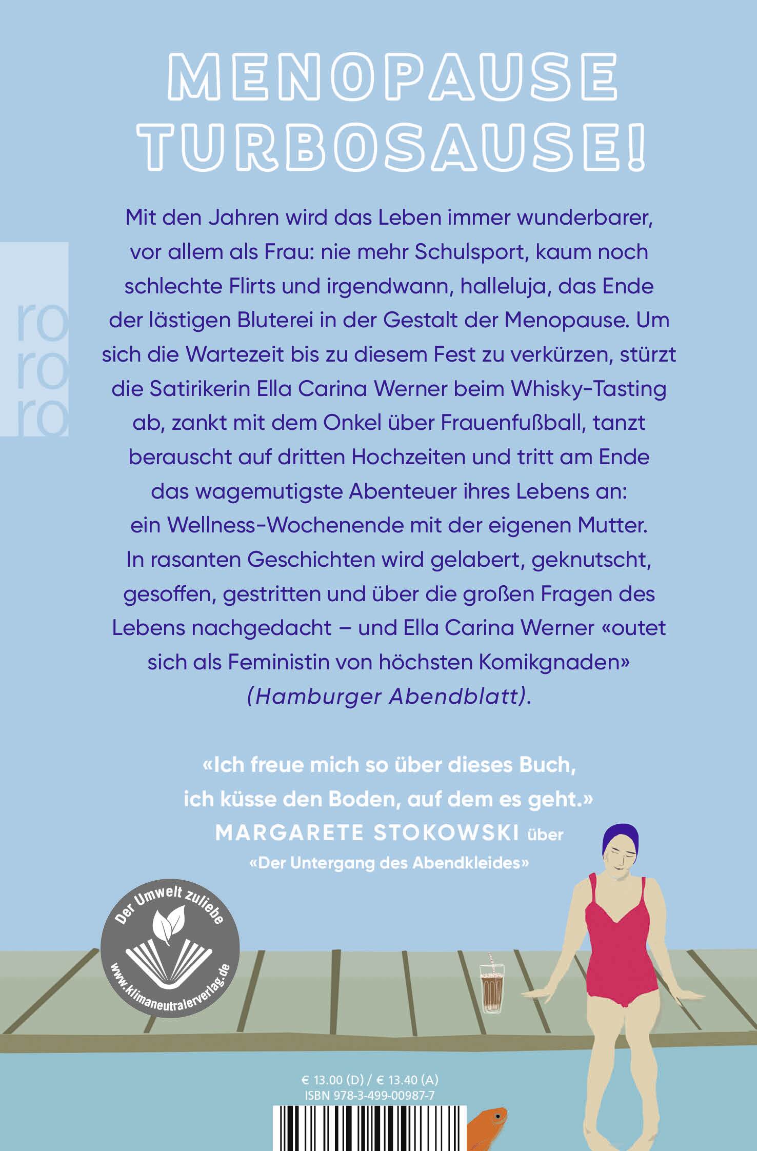 Mit den Jahren wird das Leben immer wunderbarer, vor allem als Frau: Nie mehr Schulsport, kaum noch schlechte Flirts und irgendwann, halleluja, das Ende der lästigen Bluterei in der Gestalt der Menopause. Um sich die Wartezeit bis zu diesem Fest zu verkürzen, stürzt die Satirikerin Ella Carina Werner beim Whisky-Tasting ab, zankt mit dem Onkel über Frauenfußball, tanzt berauscht auf dritten Hochzeiten und tritt am Ende das wagemutigste Abenteuer ihres Lebens an: ein Wellness-Wochenende mit der eigenen Mutter. In rasanten Geschichten wird gelabert, geknutscht, gesoffen, gestritten und über die großen Fragen des Lebens nachgedacht - und Ella Carina Werner «outet sich als Feministin von höchsten Komikgnaden» Hamburger Abendblatt.
