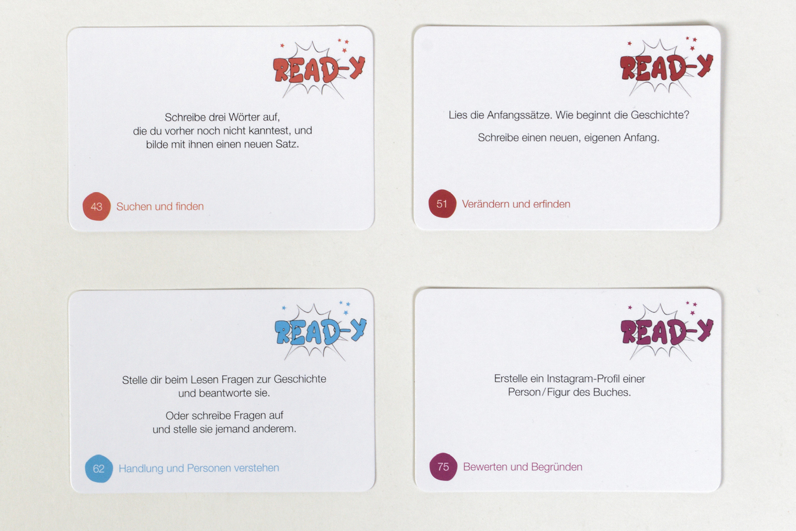 Diese Karten zum literarischen Entdecken in der 6. bis 9. Klassenstufe eröffnen im Schulalltag verankerte Lesesituationen und vielfältige gemeinsame Lesegespräche. Als motivierende und wirkungsvolle Leseaufgaben fördern und vertiefen sie echte Lesekompetenz und machen Lernende zu Leser:innen. Sie helfen 13- bis 16-jährigen Jugendlichen, Leselust zu entwickeln bzw. zu erweitern. Peers geben einander Leseempfehlungen und finden kreative Zugänge zu verschiedenen Lesestoffen.Das Kartenset ermöglicht den Schüler:innen durch eine große Auswahl an motivierenden Fragen und Aufgabenstellungen neue Sichtweisen auf gelesene Texte: in Texte eintauchen und sie verstehen wollen, über Gelesenes nachdenken und sich miteinander darüber austauschen, Inhalte vernetzen und in eigener, kreativer Weise weiterentwickeln. Die Karten sind in sieben Kompetenzstufen gegliedert, die den Fokus auf verschiedene Verarbeitungsvariationen gelesener Texte legen. Sie verknüpfen zudem spielerisch die Schlüsselkompetenzen Lesen, Hören, Sprechen und Schreiben.
