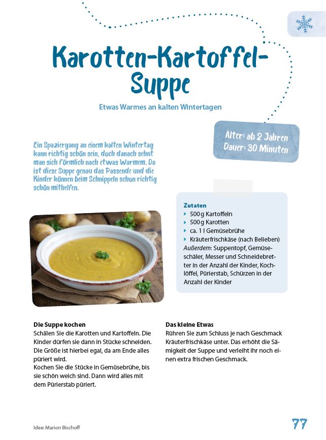 | Schlagworte | 0-3 • 0 bis 3 • Ernährung • Essen • Frühling • Herbst • Jahreszeiten • Kita-Jahr • Kochbuch • Kochen • Krippe • Krippenkinder • Ostern • Rezept • Sommer • U 3 • U3 • Weihnachten • Winter |