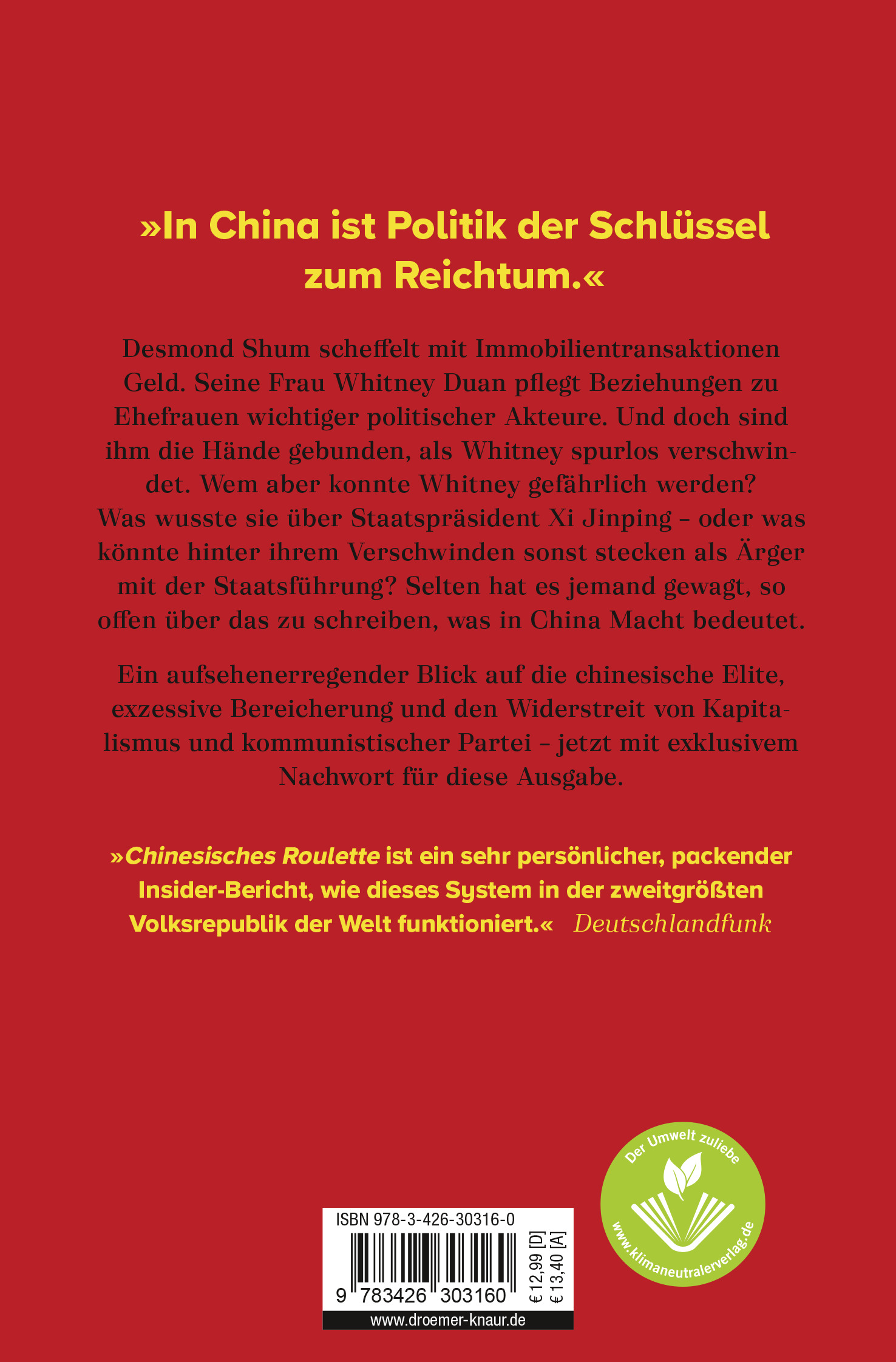 | Schlagworte | An Insider's Story of Wealth, Power, Corruption and Vengeance in Today's China • Augenzeugenbericht • Bestseller • China • China Buch • Chinas Elite • China verstehen • China Wirtschaft • Chinesische Politik • chinesische Regierung • Chinesisches Roulette • Crazy Rich Asians • crazy rich chinese • Desmond Shum • economist • Elite • Entführung • Erfahrungsberichte • Erinnerungen • Erzählendes Sachbuch • Exil • Exzess • Frauentennis • Hinterzimmer • Hongkong • Immobilien • Immobilienhai • Intrigen • Investieren in China • Investment • Jung Chang • Kai Strittmatter • Kapitalismus in China • Kommunismus • Korruption • Korruption in China • kpch • Menschenrechte in China • Menschenrechtsaktivist • Menschenrechtsverbrechen • Menschenrechtsverletzung • Milliardär • Minderheiten in China • New-York-Times-Bestseller • Olympia • olympia 2022 • Olympiade Peking • Oympische Winterspiele • Peng Shuai • Politik Buch • Politik und Gesellschaft • Politisch brisant • Politische Biografien • Politische Ideologen • Red Roulette • Sanktionen • Superreiche • Taiwan • Tennisstar • Todesdrohung • Unter der Hand • Verschwinden • Verschwunden in China • Vertuschung • wahre Begebenheit Buch • wahre geschichten bücher • Wilde Schwäne • Wirtschaftsgeschichte • Wirtschaftskrimi • Xi Jinping • Zensur • Zensur in China |