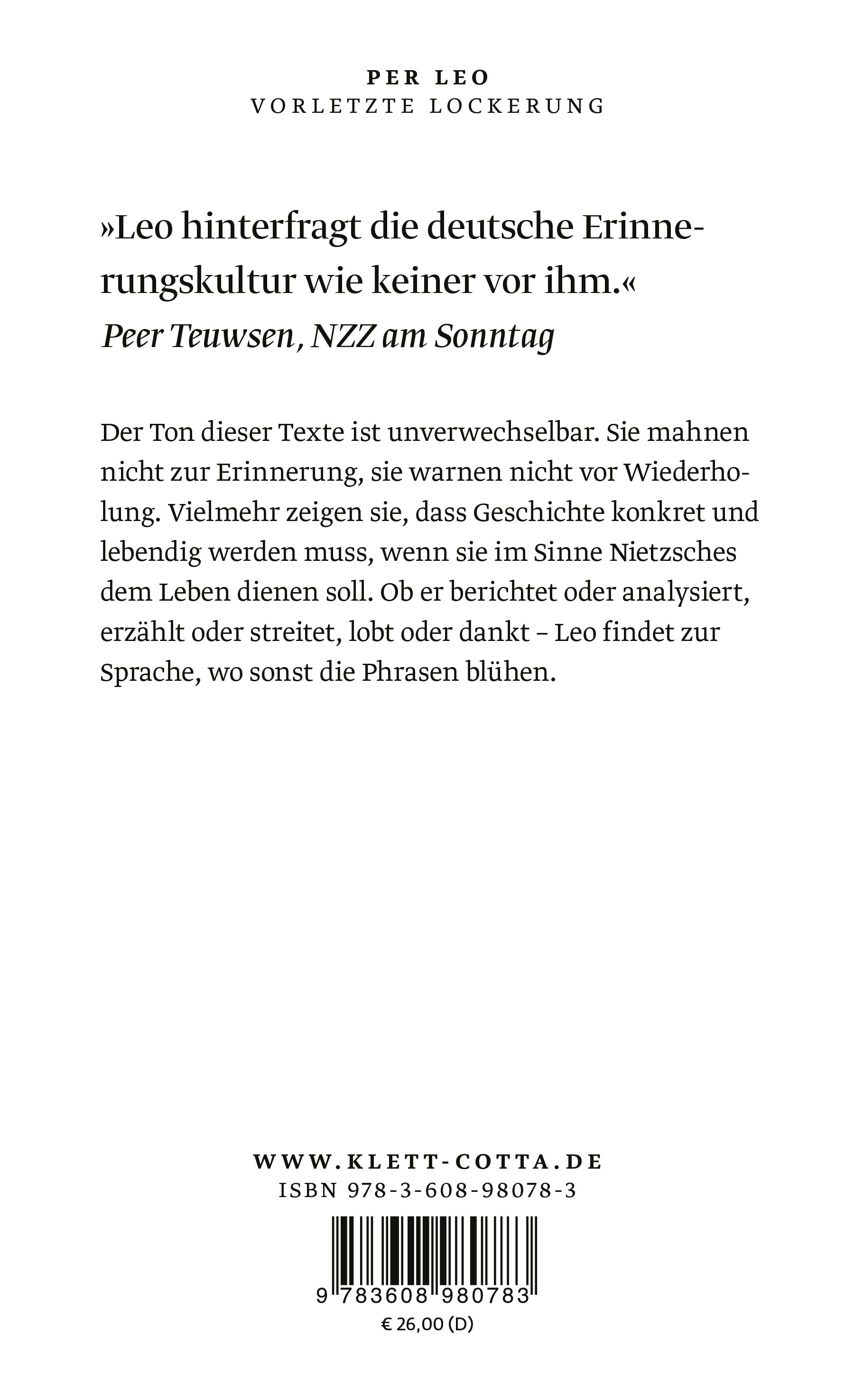 Der Ton dieser Texte ist unverwechselbar. Sie mahnen nicht zur Erinnerung, sie warnen nicht vor Wiederholung. Vielmehr zeigen sie, dass Geschichte konkret und lebendig werden muss, wenn sie im Sinne Nietzsches dem Leben dienen soll. Ob er berichtet oder analysiert, erzählt oder streitet, lobt oder dankt – Leo findet zur Sprache, wo sonst die Phrasen blühen.