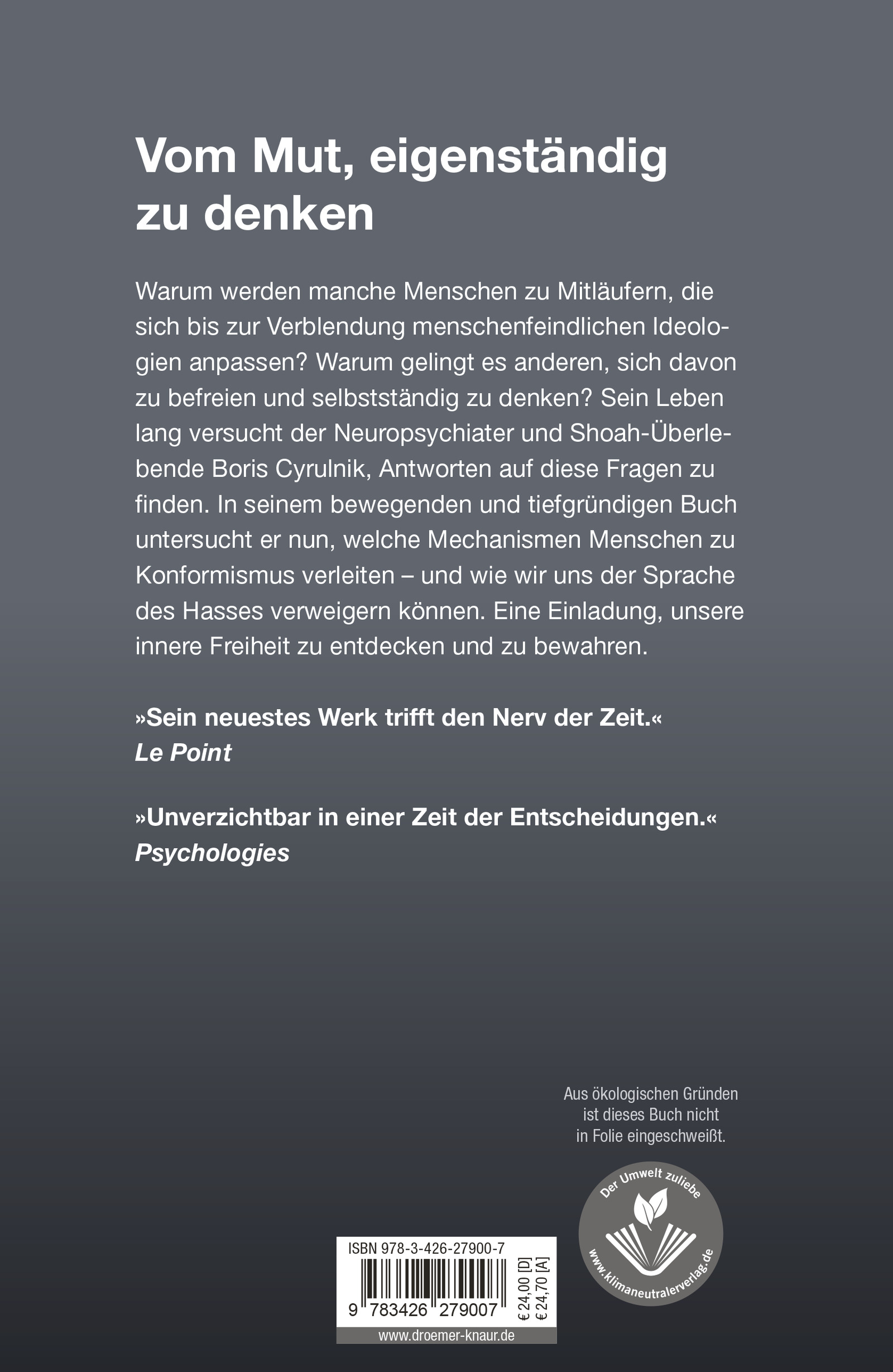 Angesichts von allzu einfachen Erklärungen mit vermeintlich leicht zu identifizierenden Schuldigen ist es für das Individuum schwierig, die Fähigkeit zur selbstständigen Urteilsbildung zu bewahren. Doch Cyrulnik lädt uns ein, unsere innere Freiheit und den Weg zum selbstständigen Denken zu entdecken.