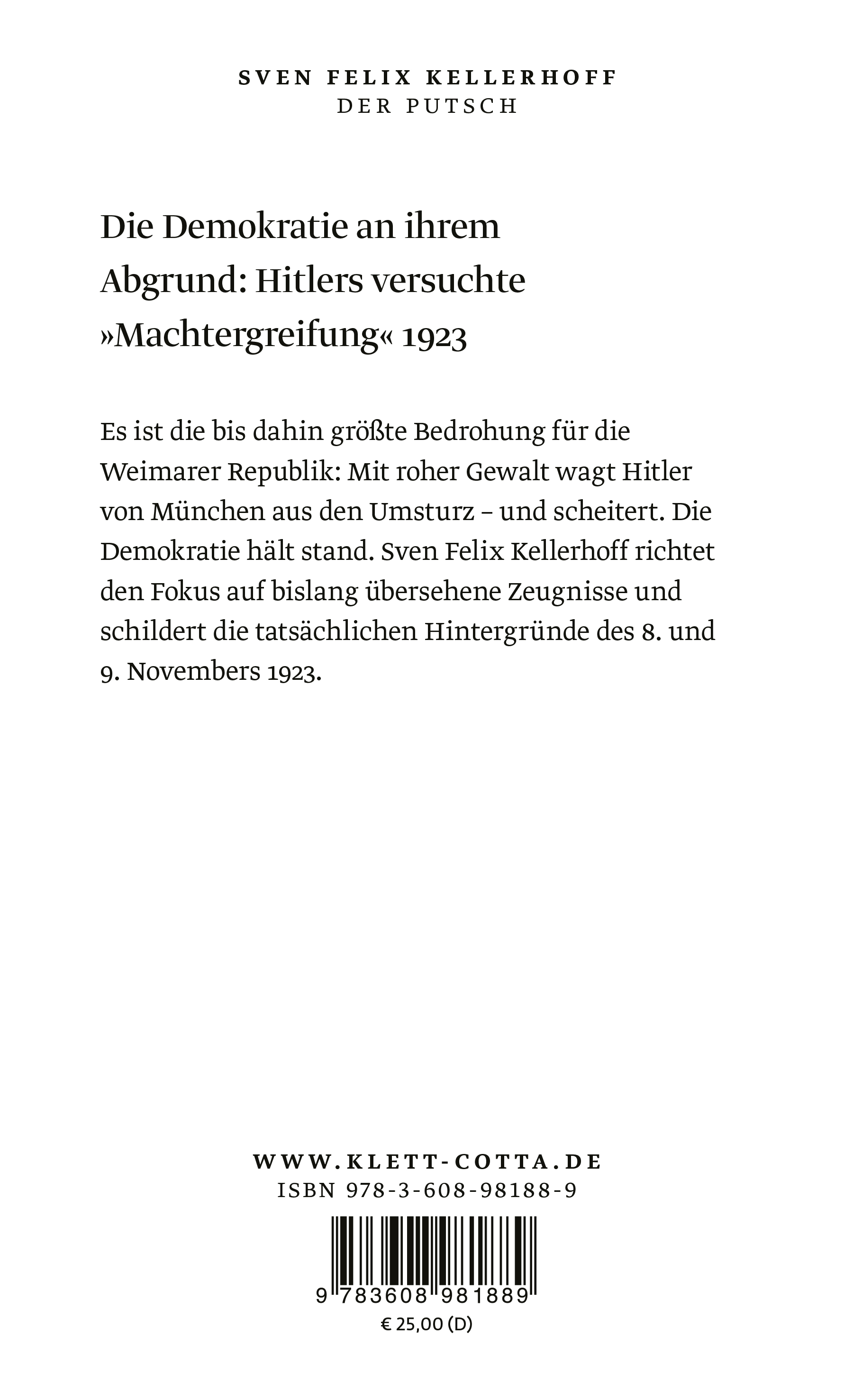 Das Vorhaben war so kühn wie radikal: Anfang November 1923 setzen Adolf Hitler und seine gewaltbereite Anhängerschaft alles auf eine Karte. Zuerst sollte in München und anschließend in ganz Deutschland die Macht übernommen werden – mit kompromissloser Härte und roher Gewalt. Die Aktion scheiterte krachend, doch ihr wirkliches Gefahrenpotenzial wird bis heute unterschätzt. Gestützt auf bisher ignorierte Quellen schlüsselt Sven Felix Kellerhoff die Hintergründe des Handstreichs auf, der die Weimarer Republik existenziell gefährdete. Nur wer das Vorbild, Mussolinis „Marsch auf Rom“ 1922, einbezieht und die geplante „Oktoberrevolution“ aus Moskau gelenkter deutscher Kommunisten, kann die Handlungsweise der Hitler-Gegner in München und Berlin verstehen. Gestützt auf zahlreiche bisher ignorierte Quellen erzählt der Autor die Geschichte des Hitlerputsches völlig neu.
