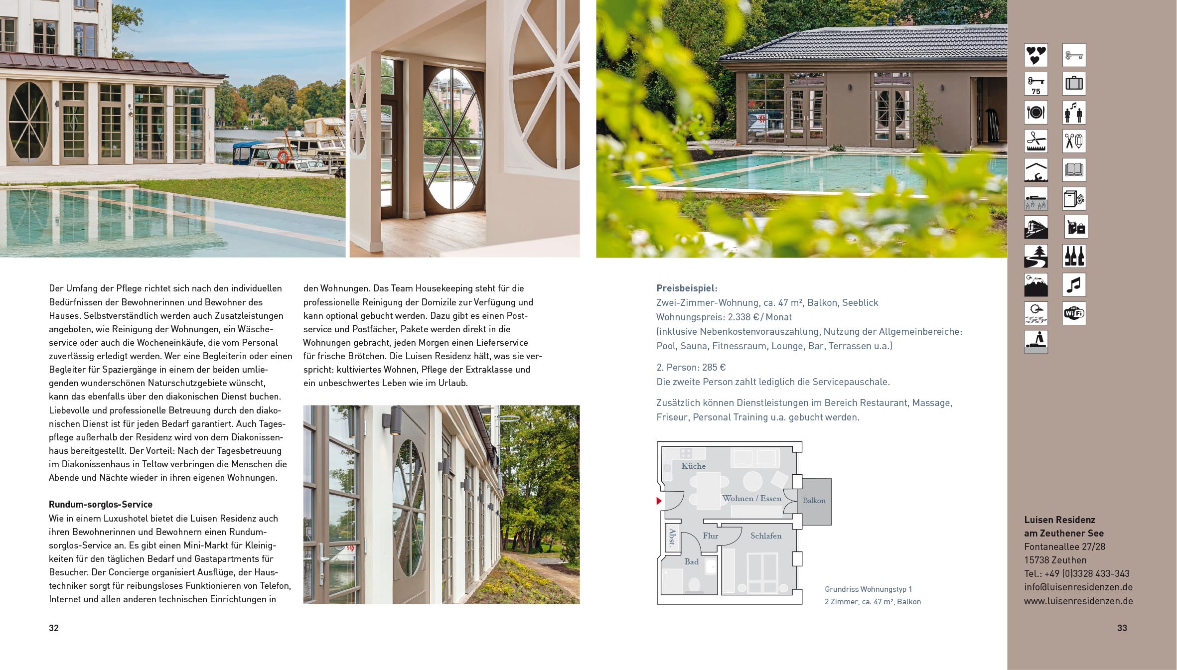 Liebe Leserinnen und Leser,Probieren geht über Studieren! Diese Weisheit ist ja nicht wirklich neu. Aber wenn es an der Zeit ist, sich noch einmal für ein neues Zuhause und eine neue Umgebung zu entscheiden, sind Erkenntnisse aus direkter Anschauung besonders nützlich und wertvoll. Wenn Sie über Ihre Ansprüche an ein komfortables und rundum bestens versorgtes Leben im verdienten Ruhestand nachdenken, können wir Ihre Entscheidung etwas leichter machen. Im jährlich erscheinenden Ratgeber "Premium Residenzen" finden Sie über 29 Residenzen in Deutschland, Kroatien, Österreich, Schweiz und Spanien jeweils sechs seitig beschrieben und bebildert, um sich mit dem Thema vertraut zu machen. Potenzielle Interessenten setzen sich mit diesem Thema immer früher auseinander, oft schon in den ersten Jahren des Ruhestands. Was sehr viel Sinn ergibt, denn eine frühe Anmeldung ist angesichts längerer Wartezeiten absolut ratsam.