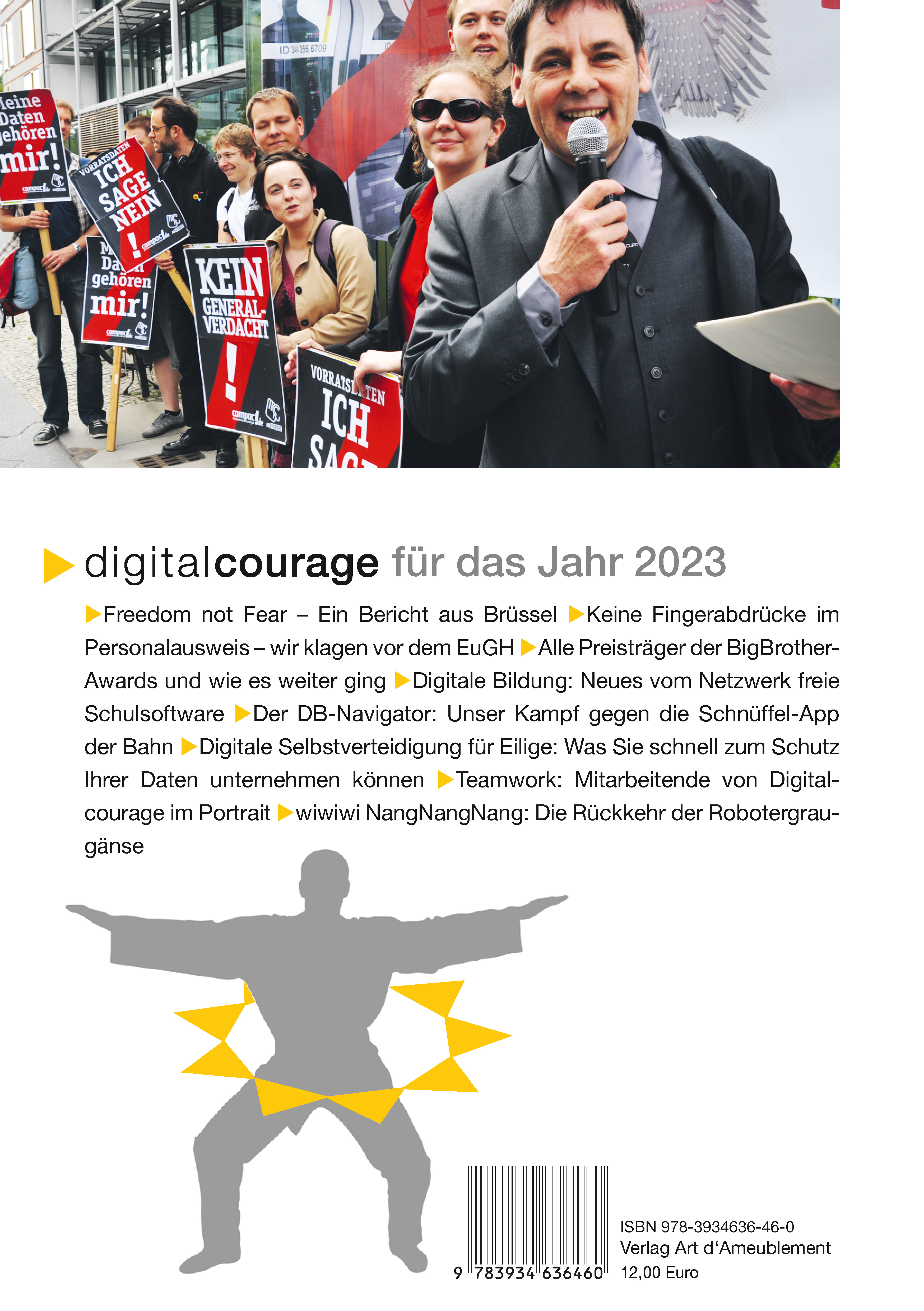 | Schlagworte | Advocacy • Aktivcongress • Aktivismus • App-Store • Bargeld • BigBrotherAwards • Bildungspaket • Bürger-Id • Chaos Communication Congress • Chatkontolle • Civicrm • Corona • Cryptpad • Dark Pattern • Datenschutz • Demonstration • Digitales Anonymes Bargeld • Digitale Selbstverteidigung • Digitalkonzerne • Digital Markets Act • Digitalzwangmelder • DNS • ebi • EU-Kommission • Europäische Bürgerinitiative • Europäischer Suchindex • Facebook • FDroid • Fediverse • Fingerabdruck • Fingerabdrücke im Personalausweis • Frank Rosengart • Freedom not fear • Freiheitsrechte • Freiheit statt Angst • Gesichtserkennung • Google • Homeoffice • Homeschooling • Internetgiganten • Internetmonopole • kurz&mündig • Lobbyismus • machtkonzentration • Mastodon • motherboard • Netzphilosophie • Netzpolitik • Netzwerk Freíe Schulsoftware • Nuudel • Openstreetmap • perso • Personalausweis • personalisierte Werbung • Peter Wedde • Podcasts • privacy • Public Domain • Public Money - Public Code • Reclaim your Face • Schulen Datenschutz • Streaming • Thilo Weichert • Überwachungsgesamtrechnung • Verbraucherschutz • Verbraucherzentralen Bundesverband • Verfassungsbeschwerden • Vorratsdatenspeicherung • vzbv • Werbetracking • Wissen für die Hosentasche |
