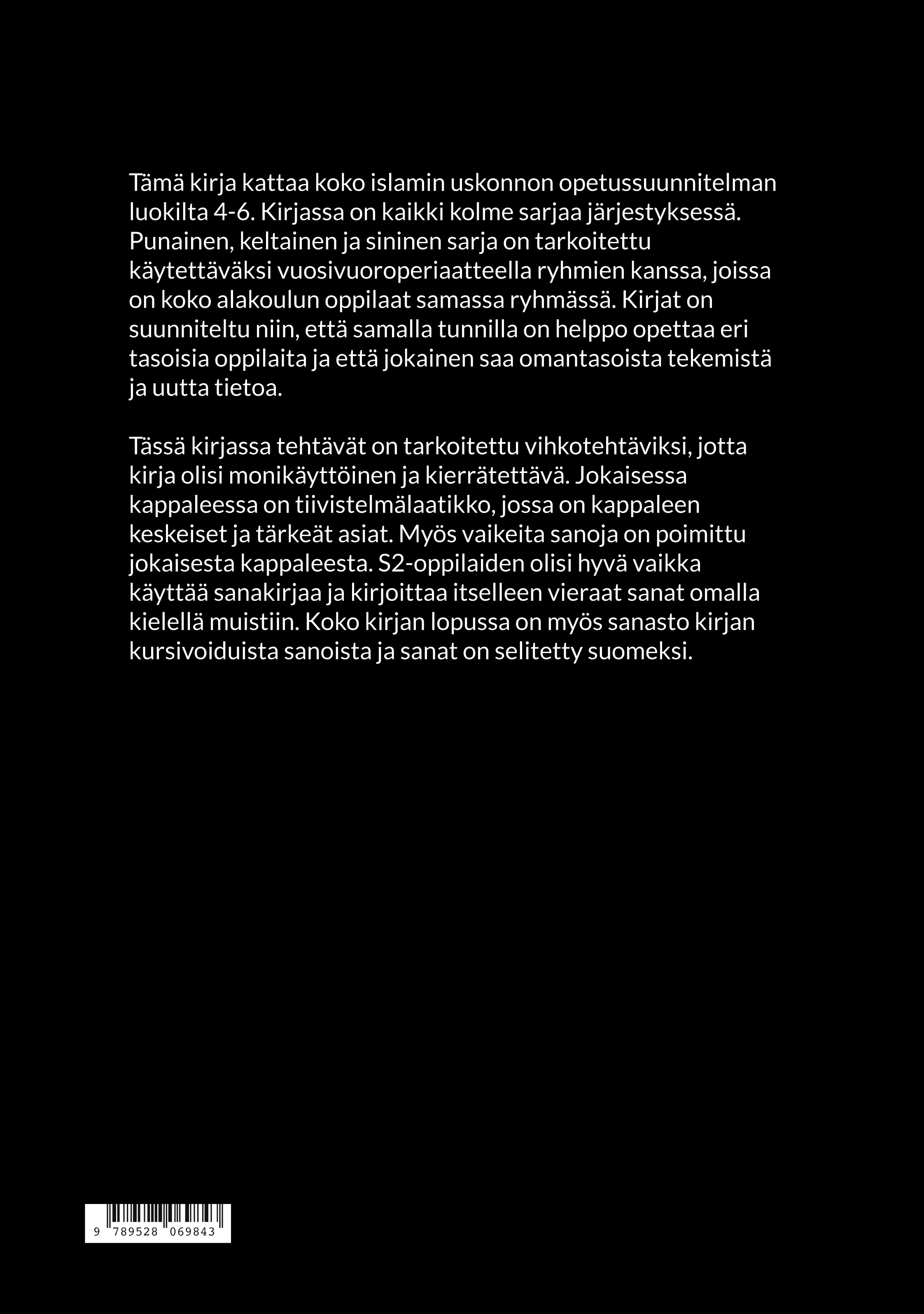 Tämä kirja kattaa koko islamin uskonnon opetussuunnitelman luokilta 4-6. Kirjassa on kaikki kolme sarjaa järjestyksessä. Punainen, keltainen ja sininen sarja on tarkoitettu käytettäväksi vuosivuoroperiaatteella ryhmien kanssa, joissa on koko alakoulun oppilaat samassa ryhmässä. Kirjat on suunniteltu niin, että samalla tunnilla on helppo opettaa eri tasoisia oppilaita ja että jokainen saa omantasoista tekemistä ja uutta tietoa.