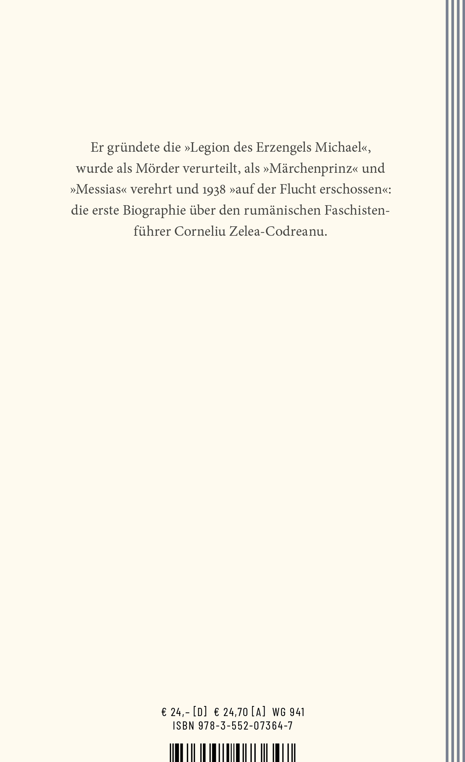 Extremer Antisemitismus, eine soziale Revolution, die Schaffung eines "Neuen Menschen": Nach Hitler und Mussolini war Corneliu Zelea-Codreanu (1899 bis 1938) der Dritte in der Reihe charismatischer Führer des Faschismus im Zwischenkriegseuropa. Der Historiker Oliver Jens Schmitt zeichnet in dieser Biographie erstmals seine Geschichte im europäischen Kontext. Wie Hitler plant Codreanu 1923 einen Putsch. Er wird verhaftet und zu einem Idol rechtsnationaler Kreise. Schmitt erzählt von Studentenunruhen, Massenaufmärschen, von der Anziehungskraft, die der Capitan besonders auf Intellektuelle wie Mircea Eliade und Emil Cioran ausübte, von seinem gewaltsamen Tod und dem Aufflackern seines Kultes in der Gegenwart.