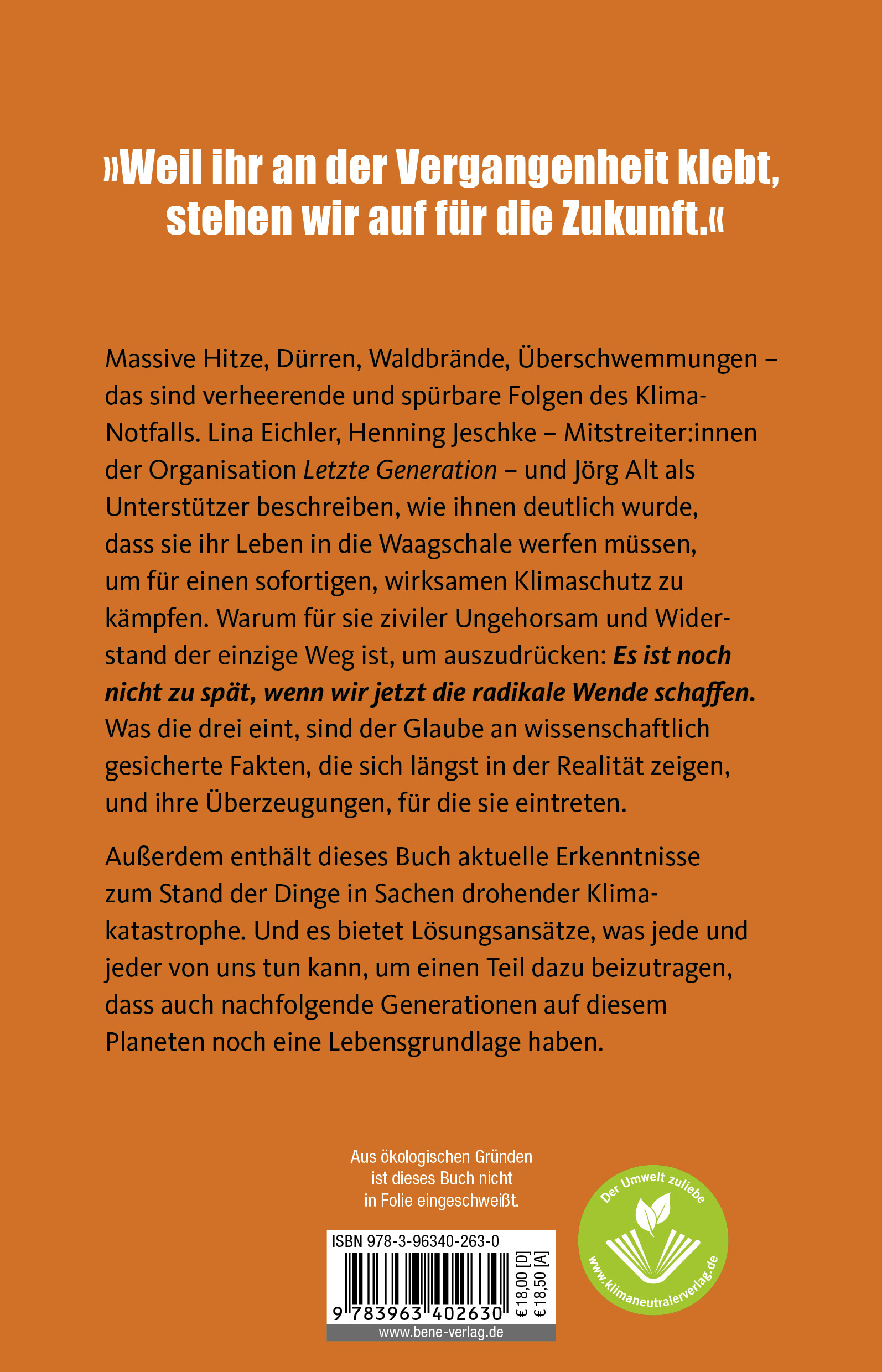 Lina Eichler, Henning Jeschke - Mitstreiter*innen der Letzten Generation - und Unterstützer Jörg Alt beschreiben in ihrem gemeinsamen Buch, wie ihnen deutlich wurde, dass sie ihr Leben in die Waagschale werfen müssen, um für einen sofortigen, wirksamen Klima-Schutz zu kämpfen. Warum für sie ziviler Ungehorsam und Widerstand der einzige Weg ist, um auszudrücken: Es ist noch nicht zu spät, wenn wir jetzt die radikale Wende schaffen.