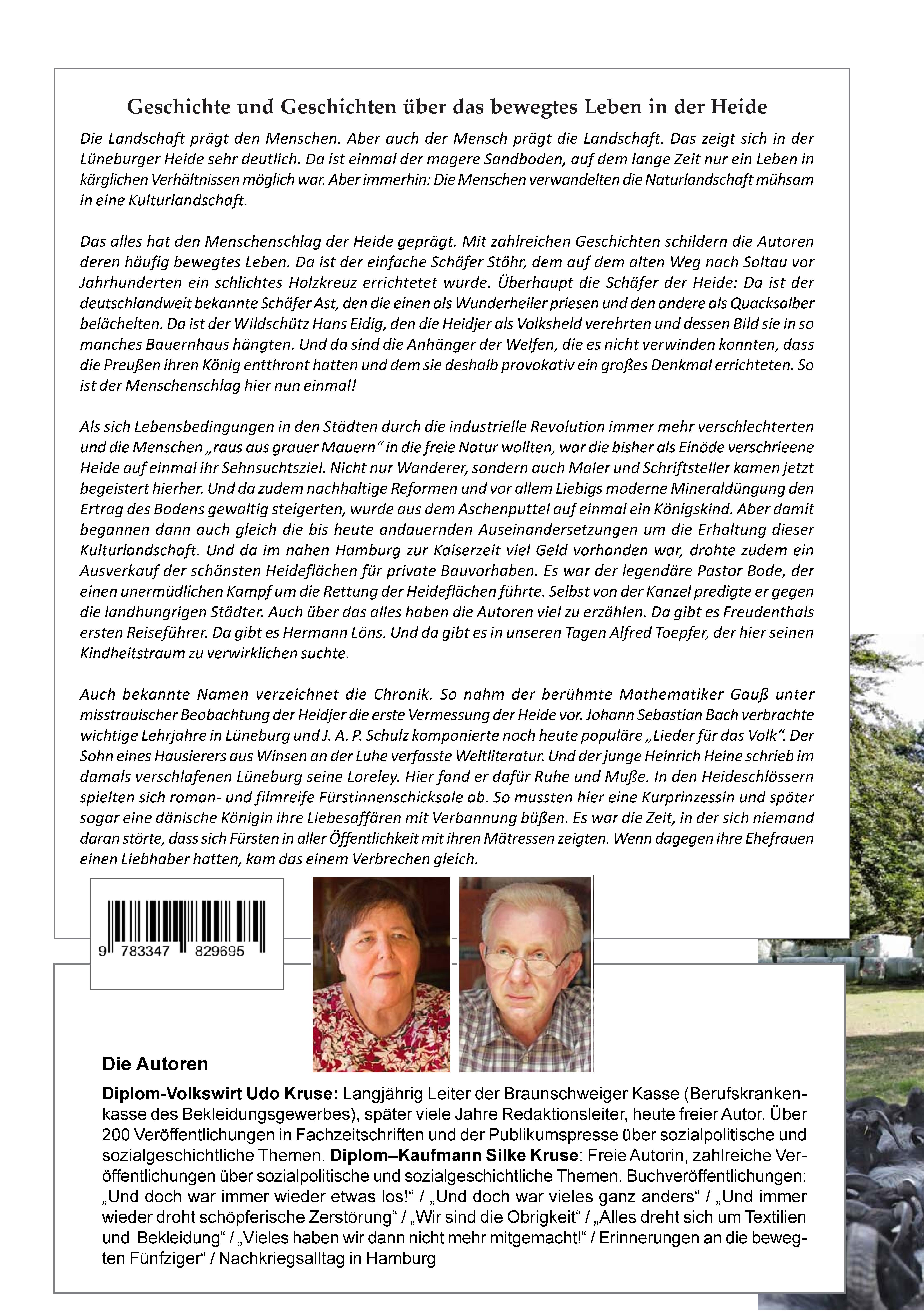Die Autoren, das Ehepaar Silke und Udo Kruse, haben seit Anfang der 70er-Jahre über 200 Beiträge vor allem in Fachzeitschriften, aber auch in der Publikumspresse über sozialpolitische und sozialgeschichtliche Themen gemeinsam veröffentlicht. Dazu kommen verschiedene Buchveröffentlichungen. Bei ihren Veröffentlichungen kommt es ihnen darauf an, fachspezifische Themen populär aufzugreifen – sie also auf der Basis nüchterner Fachinformationen (meistens mit Literaturangaben belegt) verständlich und interessant aufzuarbeiten. Dass das gelungen ist, wurde ihnen immer wieder bei Lesungen und Infoveranstaltungen bestätigt. Eine große Rolle spielten hierbei auch jahrzehntelange berufliche Erfahrungen (auch und gerade im sozialpolitischen Raum und in der Marktforschung). Land und Leute der Lüneburger Heide kennen beide bestens seit ihrer Kindheit. Sie sind hier zu Hause. So hat der Verfasser viele der Geschichten und Darstellungen zum ersten Male in seiner Kindheit von seiner Großmutter gehört. Sie wurden hier über Generationen weitererzählt und waren zumindest in den 50er- und 60er-Jahren im Lüneburgischen präsent. Silke Kruse hat Ende der 60er-/Anfang der 70er-Jahre an der Universität Hamburg Betriebswirtschaftslehre studiert. Das war damals eine männliche Domäne. Ihr Abschluss hieß denn auch „Diplom-Kaufmann“. Aber das ist lange her. Jetzt haben die Frauen aufgeholt, und ihr Abschluss heißt „Diplom-Kauffrau“. Für beide waren neben dem wirtschaftswissenschaftlichen Studium sechs Semester Soziologie enorm wichtig – gerade nämlich in den damals so bewegten Jahren der Soziologie, in der höchst engagiert der Alltag in der Nachkriegszeit aufgearbeitet wurde. Von daher zählen sie sich zur 1968er-Generation. Vieles davon ist ihnen heute eine wertvolle Grundlage, um diese Jahre mit Abstand zu schildern - so zum Beispiel Alexander Mitscherlichs „Vaterlose Gesellschaft“ oder Karl Martin Boltes „Deutsche Gesellschaft im Wandel“.