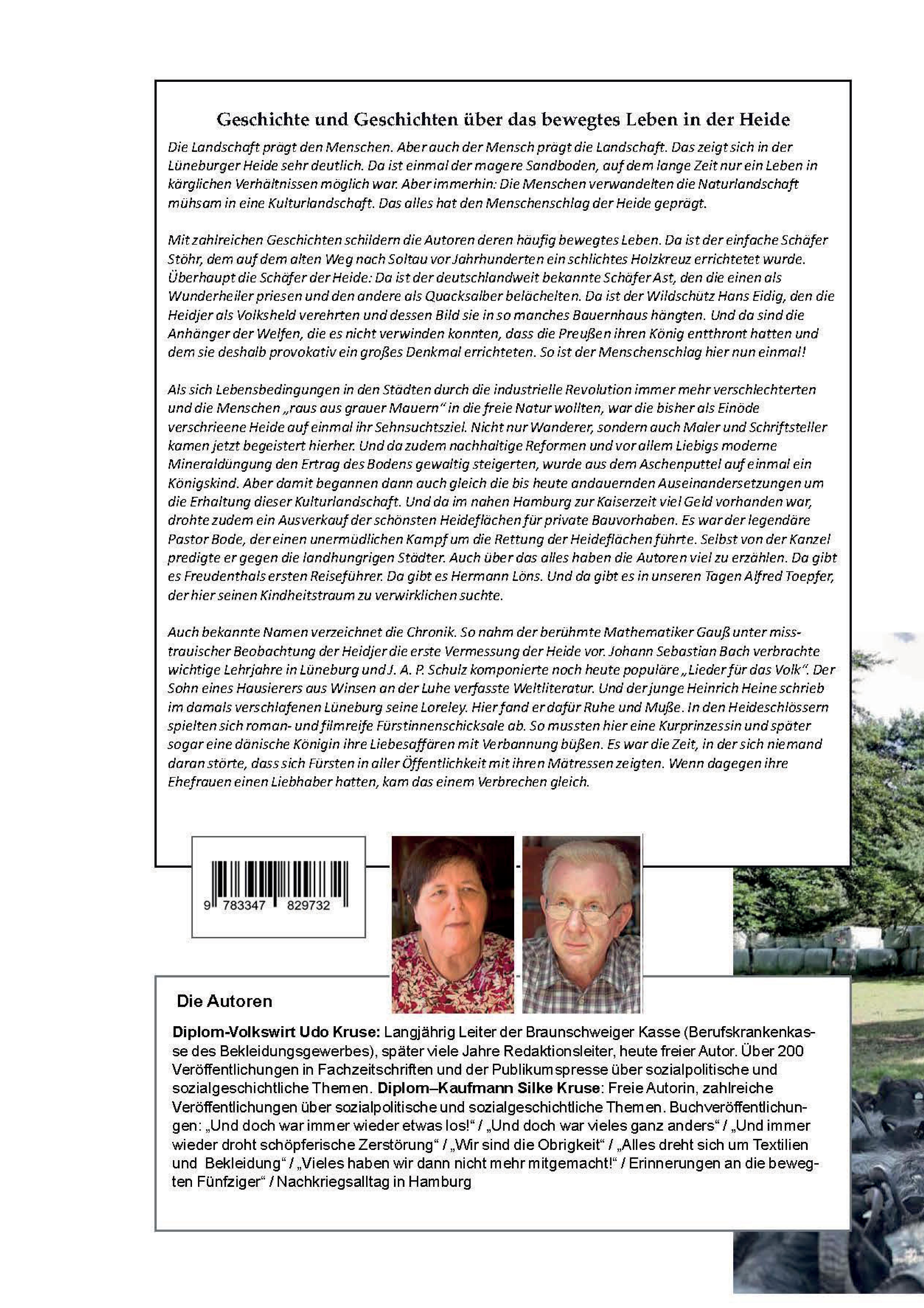 Die Autoren, das Ehepaar Silke und Udo Kruse, haben seit Anfang der 70er-Jahre über 200 Beiträge vor allem in Fachzeitschriften, aber auch in der Publikumspresse über sozialpolitische und sozialgeschichtliche Themen gemeinsam veröffentlicht. Dazu kommen verschiedene Buchveröffentlichungen. Bei ihren Veröffentlichungen kommt es ihnen darauf an, fachspezifische Themen populär aufzugreifen – sie also auf der Basis nüchterner Fachinformationen (meistens mit Literaturangaben belegt) verständlich und interessant aufzuarbeiten. Dass das gelungen ist, wurde ihnen immer wieder bei Lesungen und Infoveranstaltungen bestätigt. Eine große Rolle spielten hierbei auch jahrzehntelange berufliche Erfahrungen (auch und gerade im sozialpolitischen Raum und in der Marktforschung). Land und Leute der Lüneburger Heide kennen beide bestens seit ihrer Kindheit. Sie sind hier zu Hause. So hat der Verfasser viele der Geschichten und Darstellungen zum ersten Male in seiner Kindheit von seiner Großmutter gehört. Sie wurden hier über Generationen weitererzählt und waren zumindest in den 50er- und 60er-Jahren im Lüneburgischen präsent. Silke Kruse hat Ende der 60er-/Anfang der 70er-Jahre an der Universität Hamburg Betriebswirtschaftslehre studiert. Das war damals eine männliche Domäne. Ihr Abschluss hieß denn auch „Diplom-Kaufmann“. Aber das ist lange her. Jetzt haben die Frauen aufgeholt, und ihr Abschluss heißt „Diplom-Kauffrau“. Für beide waren neben dem wirtschaftswissenschaftlichen Studium sechs Semester Soziologie enorm wichtig – gerade nämlich in den damals so bewegten Jahren der Soziologie, in der höchst engagiert der Alltag in der Nachkriegszeit aufgearbeitet wurde. Von daher zählen sie sich zur 1968er-Generation. Vieles davon ist ihnen heute eine wertvolle Grundlage, um diese Jahre mit Abstand zu schildern - so zum Beispiel Alexander Mitscherlichs „Vaterlose Gesellschaft“ oder Karl Martin Boltes „Deutsche Gesellschaft im Wandel“.