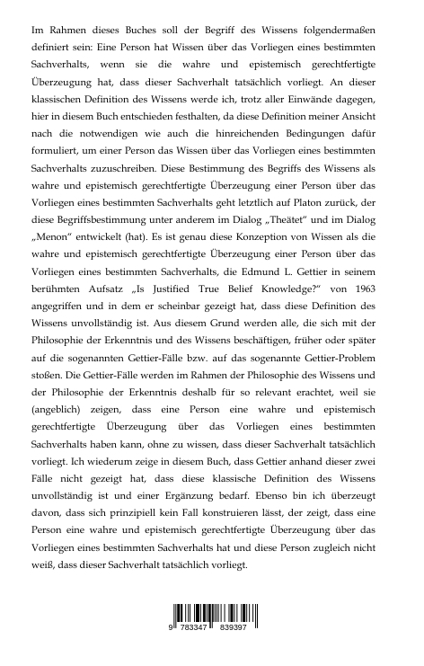 Im Rahmen dieses Buches soll der Begriff des Wissens folgendermaßen definiert sein: Eine Person hat Wissen über das Vorliegen eines bestimmten Sachverhalts, wenn sie die wahre und epistemisch gerechtfertigte Überzeugung hat, dass dieser Sachverhalt tatsächlich vorliegt. An dieser klassischen Definition des Wissens werde ich, trotz aller Einwände dagegen, hier in diesem Buch entschieden festhalten, da diese Definition meiner Ansicht nach die notwendigen wie auch die hinreichenden Bedingungen dafür formuliert, um einer Person das Wissen über das Vorliegen eines bestimmten Sachverhalts zuzuschreiben. Diese Bestimmung des Begriffs des Wissens als wahre und epistemisch gerechtfertigte Überzeugung einer Person über das Vorliegen eines bestimmten Sachverhalts geht letztlich auf Platon zurück, der diese Begriffsbestimmung unter anderem im Dialog "Theätet" und im Dialog "Menon" entwickelt (hat). Es ist genau diese Konzeption von Wissen als die wahre und epistemisch gerechtfertigte Überzeugung einer Person über das Vorliegen eines bestimmten Sachverhalts, die Edmund L. Gettier in seinem berühmten Aufsatz "Is Justified True Belief Knowledge?" von 1963 angegriffen und in dem er scheinbar gezeigt hat, dass diese Definition des Wissens unvollständig ist. Aus diesem Grund werden alle, die sich mit der Philosophie der Erkenntnis und des Wissens beschäftigen, früher oder später auf die sogenannten Gettier-Fälle bzw. auf das sogenannte Gettier-Problem stoßen. Die Gettier-Fälle werden im Rahmen der Philosophie des Wissens und der Philosophie der Erkenntnis deshalb für so relevant erachtet, weil sie (angeblich) zeigen, dass eine Person eine wahre und epistemisch gerechtfertigte Überzeugung über das Vorliegen eines bestimmten Sachverhalts haben kann, ohne zu wissen, dass dieser Sachverhalt tatsächlich vorliegt. Ich wiederum zeige in diesem Buch, dass Gettier anhand dieser zwei Fälle nicht gezeigt hat, dass diese klassische Definition des Wissens unvollständig ist und einer Ergänzung bedarf. Ebenso bin ich überzeugt davon, dass sich prinzipiell kein Fall konstruieren lässt, der zeigt, dass eine Person eine wahre und epistemisch gerechtfertigte Überzeugung über das Vorliegen eines bestimmten Sachverhalts hat und diese Person zugleich nicht weiß, dass dieser Sachverhalt tatsächlich vorliegt.