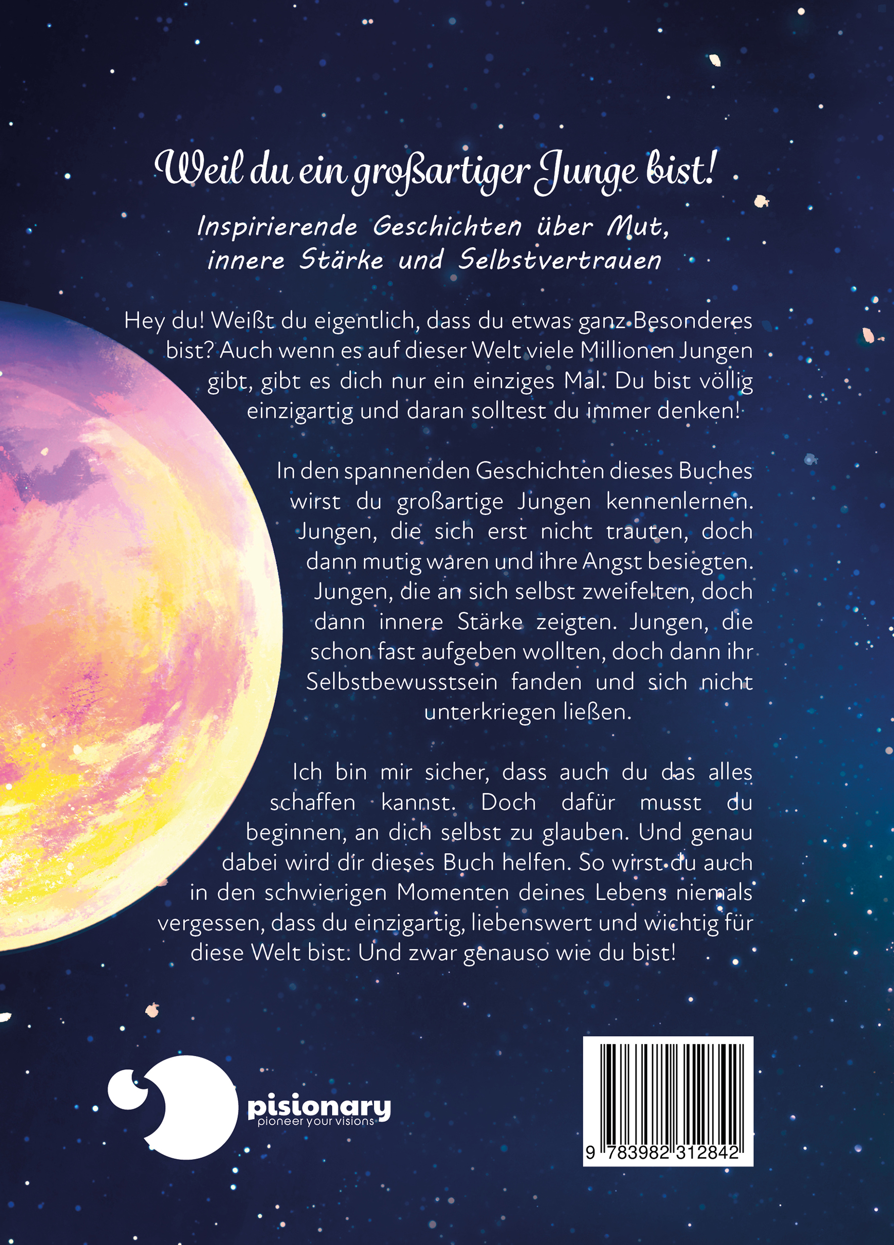 Hey du! Weißt du eigentlich, dass du etwas ganz Besonderes bist?Auch wenn es auf dieser Welt viele Millionen Jungen gibt, gibt es dich nur ein einziges Mal. Du bist völlig einzigartig und daran solltest du immer denken!Die Welt steckt voller kleiner und großer Hürden und manchmal wirst du vielleicht denken: Das kann ich nicht schaffen! Vielleicht wirst du Angst bekommen oder an dir selbst zweifeln. Doch an dieser Stelle möchte ich dir ein Geheimnis verraten. Von Zeit zu Zeit geht es jedem Menschen so! Sogar den Erwachsenen.In diesem Buch wirst du großartige Jungen kennenlernen.Jungen, die sich erst nicht trauten, doch dann mutig waren und ihre Angst besiegten. Jungen, die an sich selbst zweifelten, doch dann innere Stärke zeigten. Jungen, die schon fast aufgeben wollten, doch dann ihr Selbstbewusstsein fanden und sich nicht unterkriegen ließen.Ich bin mir sicher, dass auch du das alles schaffen kannst. Doch dafür musst du beginnen, an dich selbst zu glauben. Und genau dabei wird dir dieses Buch helfen. So wirst du auch in den schwierigen Momenten deines Lebens niemals vergessen, dass du einzigartig, liebenswert und wichtig für diese Welt bist. Und zwar genauso wie du bist!Das erwartet dich in diesem Buch:- Inspirierende Geschichten für Jungen über Mut, innere Stärke und Selbstbewusstsein.- Spannender und realitätsnaher Schreibstil. Zum Vorlesen und Selbstlesen geeignet.- Wunderschöne Bilder und stärkende Ich-Botschaften zum Aufbau einer starken Persönlichkeit.Dieses Buch hilft Jungen dabei:- Sich selbst zu akzeptieren (mit allen Stärken und Schwächen)- Offen mit ihren Eltern über ihre Probleme zu sprechen- Ängste zu überwinden und mutig zu sein- Besser mit Leistungsdruck in der Schule umzugehen- Achtsamkeit und Selbstbewusstsein zu entwickeln