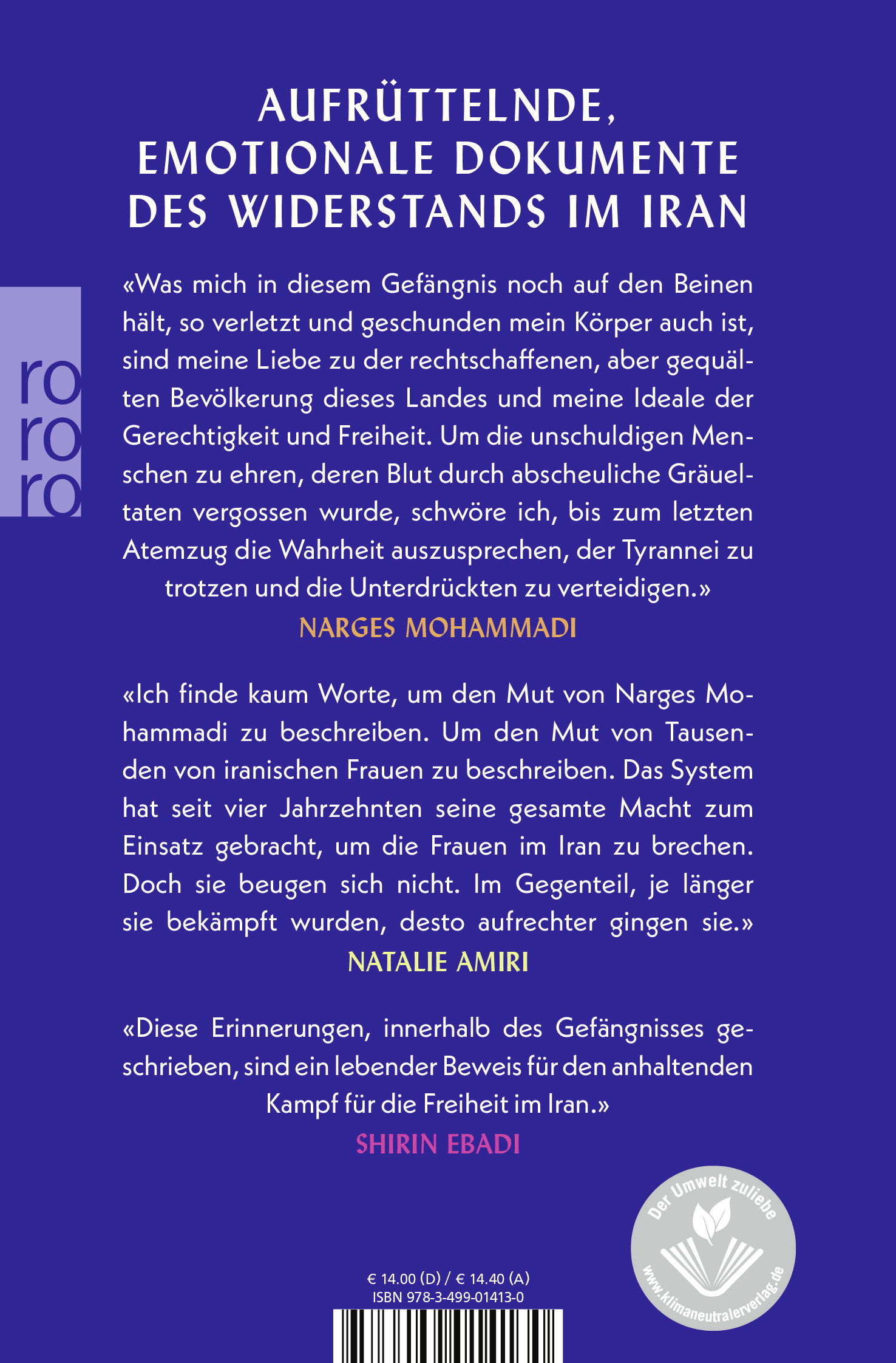 Die deutsche Übersetzung ist genau wie das persische Original ein Gemeinschaftswerk unterschiedlicher Frauen. Narges Mohammadis Buch ist ein Beweis für die aktuellen Menschenrechtsverletzungen im Iran und ein Aufruf an Unterstützer auf der ganzen Welt, den Kampf nicht aufzugeben.