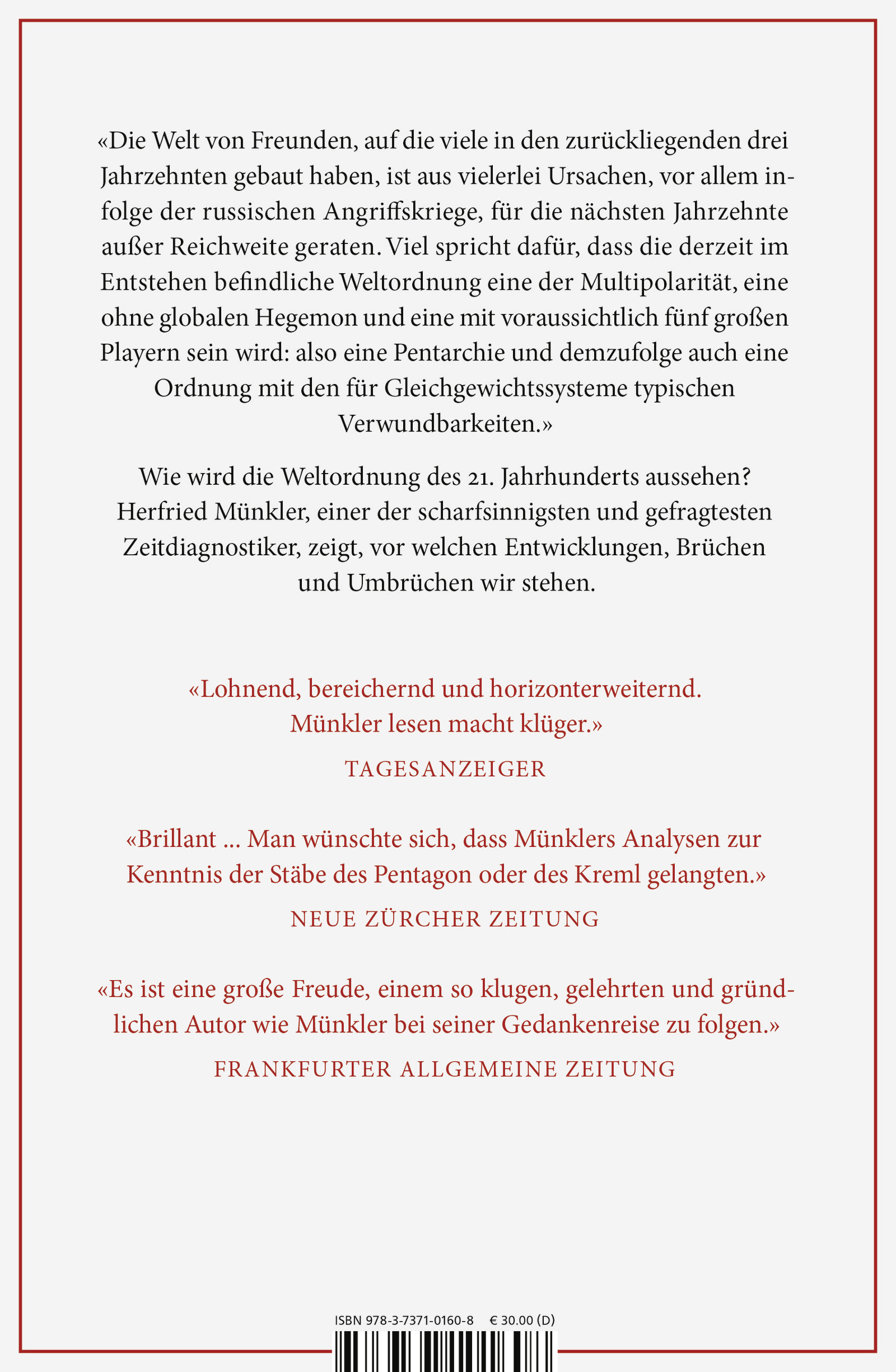 »Es ist eine große Freude, einem so klugen, gelehrten und gründlichen Autor wie Münkler bei seiner Gedankenreise zu folgen.« – Frankfurter Allgemeine Zeitung