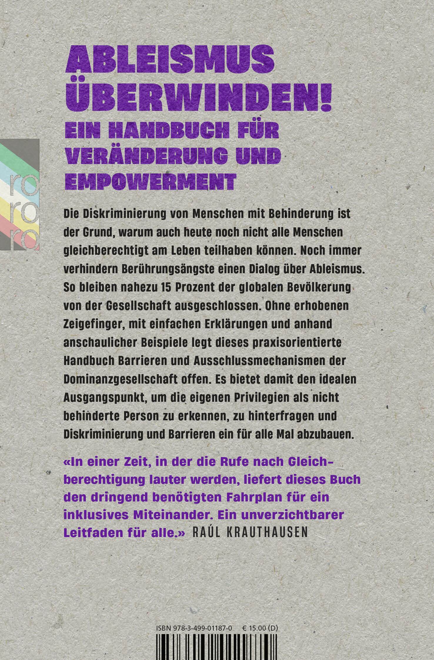 Die Diskriminierung von Menschen mit Behinderungen ist der Grund, warum auch heute noch nicht alle Menschen gleichberechtigt am Leben teilhaben können. Noch immer verhindern Berührungsängste einen Dialog über Ableismus. So bleiben nahezu 15 Prozent der globalen Bevölkerung von der Gesellschaft ausgeschlossen. Ohne erhobenen Zeigefinger, mit einfachen Erklärungen und anhand anschaulicher Beispiele legt dieses praxisorientierte Handbuch Barrieren und Ausschlussmechanismen der Dominanzgesellschaft offen. Es bietet damit den idealen Ausgangspunkt, um die eigenen Privilegien als nicht behinderte Person zu erkennen, zu hinterfragen und Diskriminierung und Barrieren ein für alle Mal abzubauen.