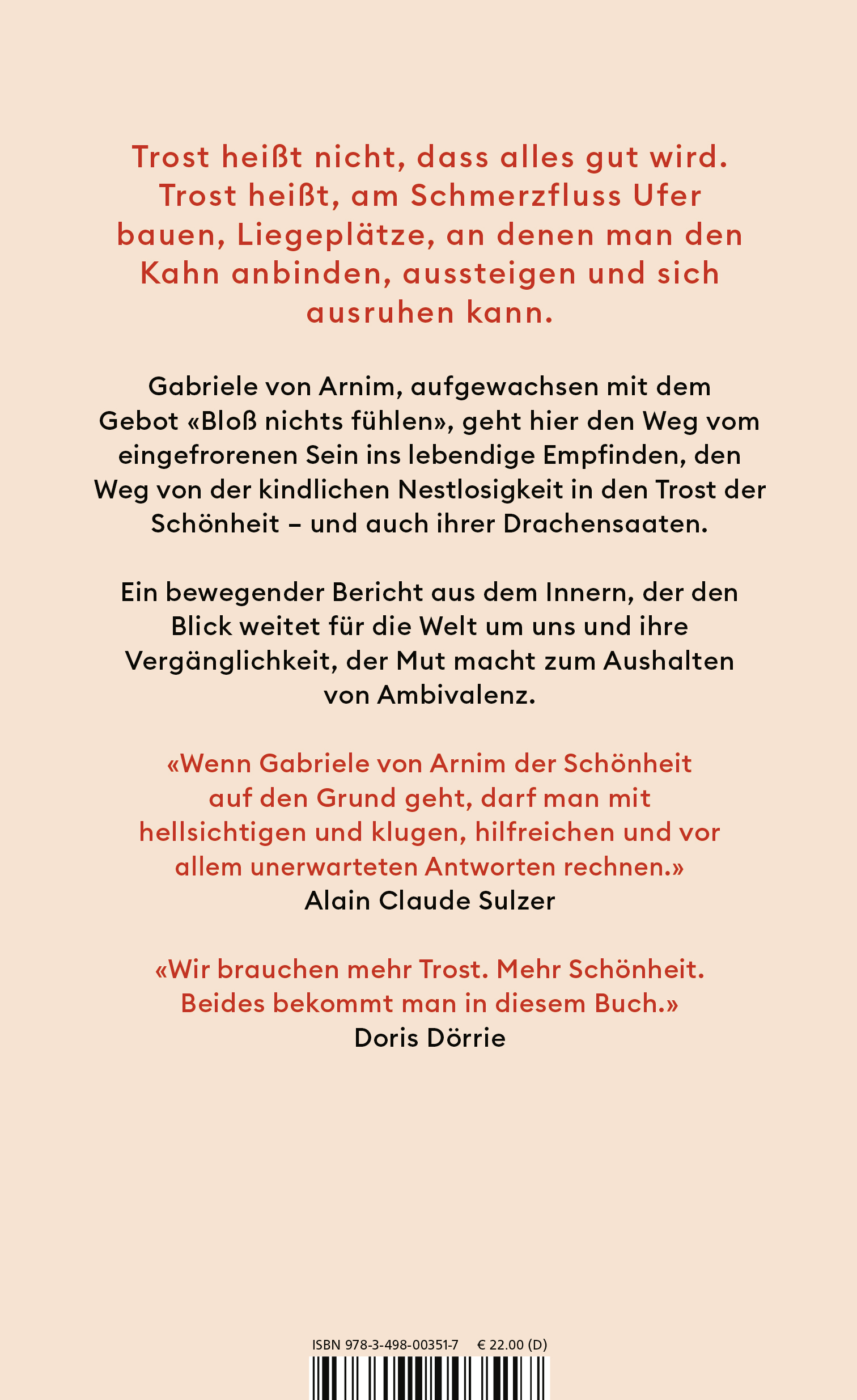 Der Trost der Schönheit ist eine schillernde Verbindung aus autobiografischem und essayistischem Erzählen: keine Kulturgeschichte, die ihren Gegenstand mit Theorie einhegen will, sondern eine literarische Spurensuche. Gabriele von Arnim fragt nach den Formen und Wirkungen dessen, was wir schön nennen; nach dem Glück und den dunklen Seiten der Empfindsamkeit. Die Suche führt zurück in die Kindheit, zu einem Mädchen aus kühl geführtem Haus, das erst lernen muss, zu fühlen, um Schönheit - einen tröstlichen Moment lang - in all ihrer endlichen Fülle wahrnehmen zu können.