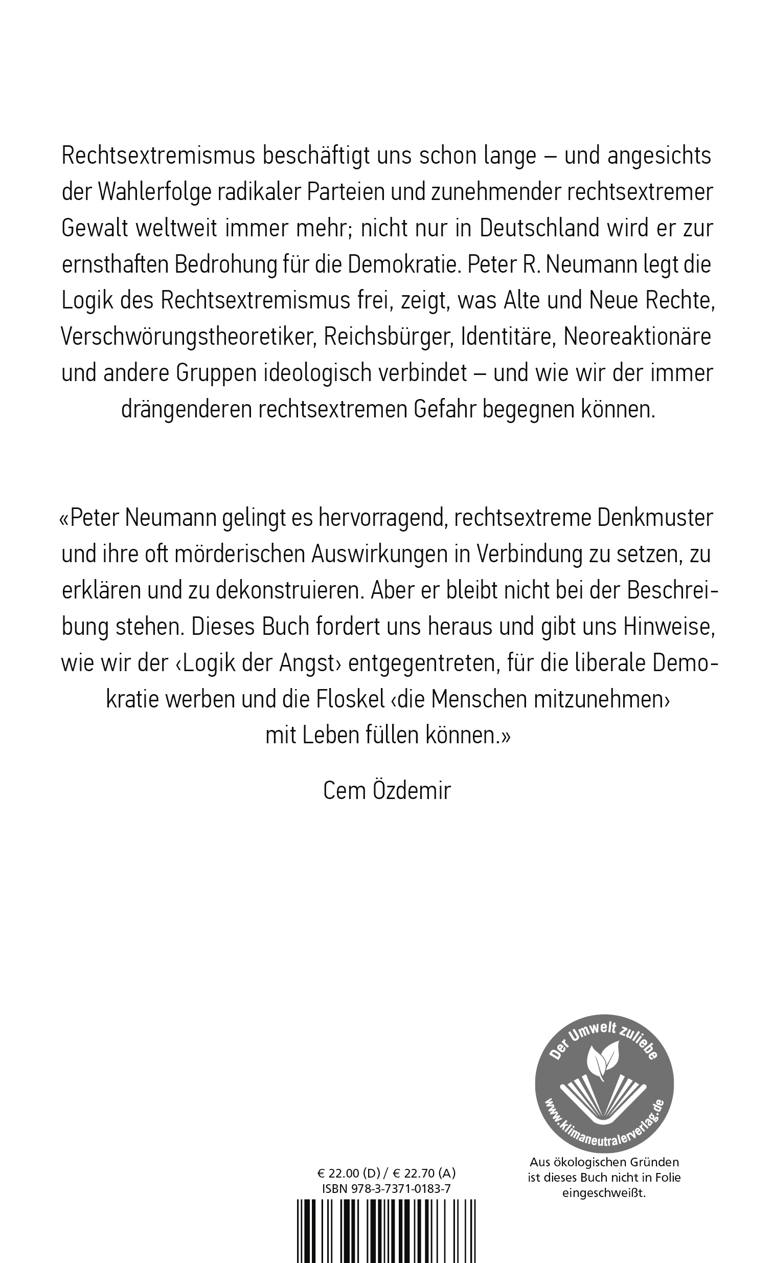 »Peter Neumann gelingt es hervorragend, rechtsextreme Denkmuster und ihre oft mörderischen Auswirkungen in Verbindung zu setzen, zu erklären und zu dekonstruieren. Aber er bleibt nicht bei der Beschreibung stehen. Dieses Buch fordert uns heraus und gibt uns Hinweise, wie wir der 'Logik der Angst' entgegentreten, für die liberale Demokratie werben und die Floskel 'die Menschen mitzunehmen' mit Leben füllen können.« Cem Özdemir