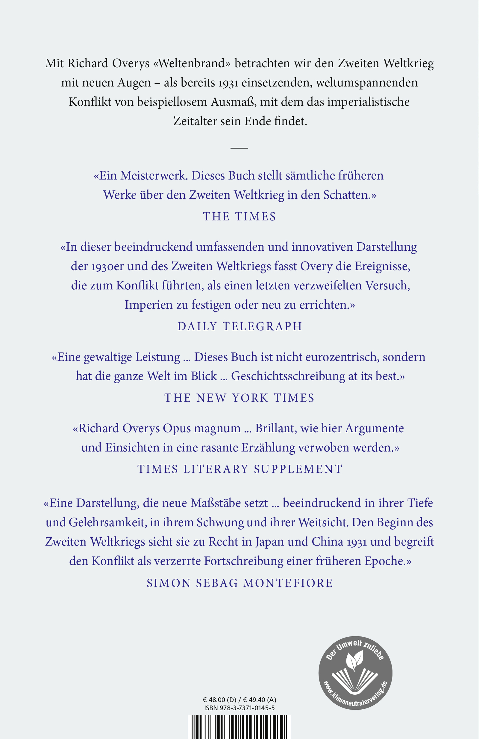 »Dass es geradezu zwingend ist, der außereuropäischen Dimension des Weltkriegs deutlich mehr Aufmerksamkeit als bisher zu widmen – daran kann nach der Lektüre von Richard Overys souverän erzählter und argumentierter Geschichte des Weltenbrands von 1931 bis 1945 kein Zweifel bestehen.«