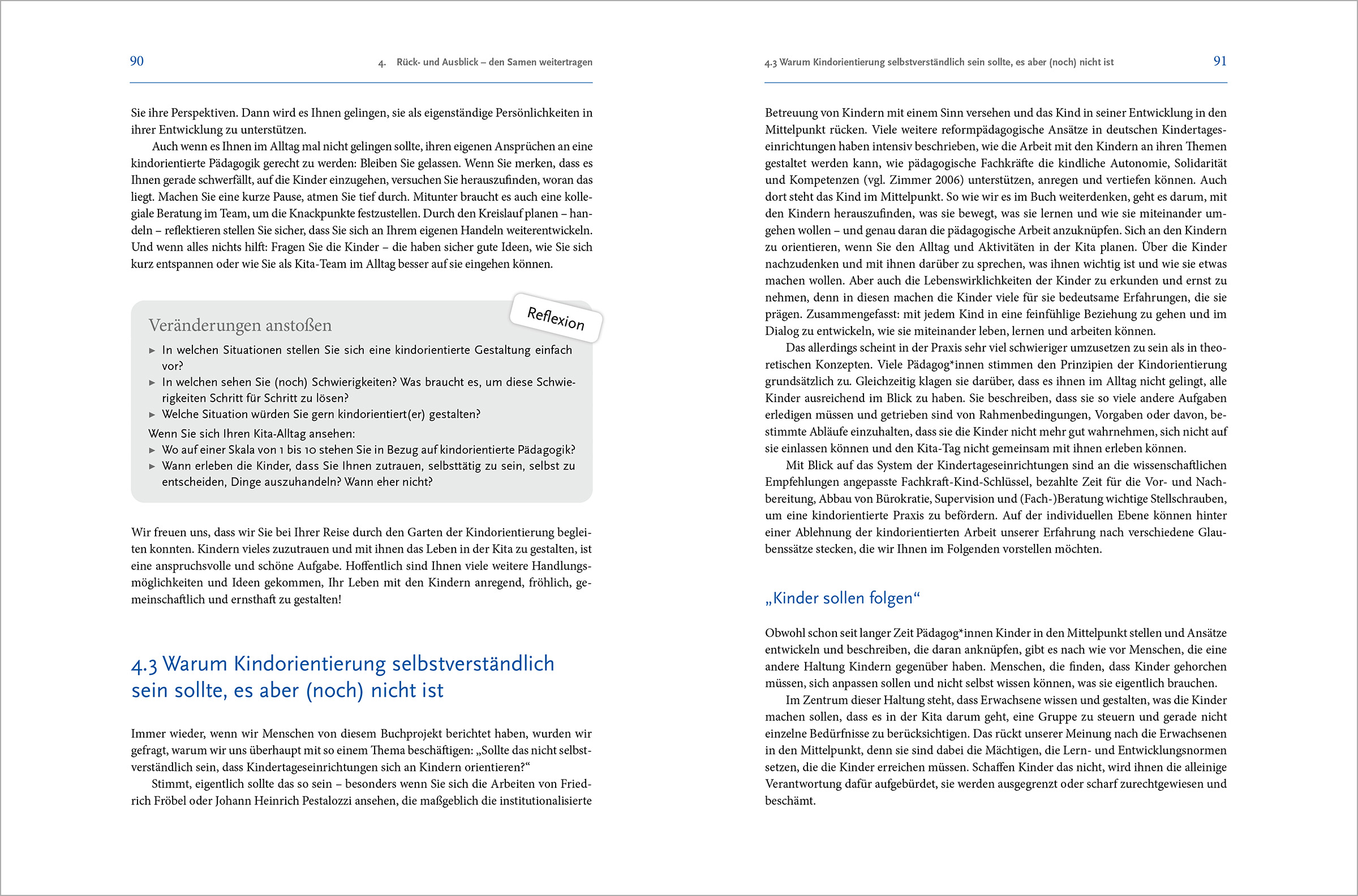 Kindorientierung ist als Begriff ist in aller Munde – aber was bedeutet das eigentlich? Das Buch klärt mit zahlreichen Praxisbeispielen und Reflexionsfragen die Grundprinzipien einer kindorientierten Pädagogik. Die Autorinnen zeigen anhand konkreter Alltagssituationen, wie pädagogische Fachkräfte den Kita-Alltag an den Kindern orientieren und dadurch die Rechte der Kinder auf Eigenständigkeit, Selbstbehauptung und Selbstwirksamkeit verwirklichen können: Vom Ankommen und Verabschieden über das Essen, Pflegen und Ausruhen bis hin zur Raumgestaltung, Projektarbeit und vielem mehr.