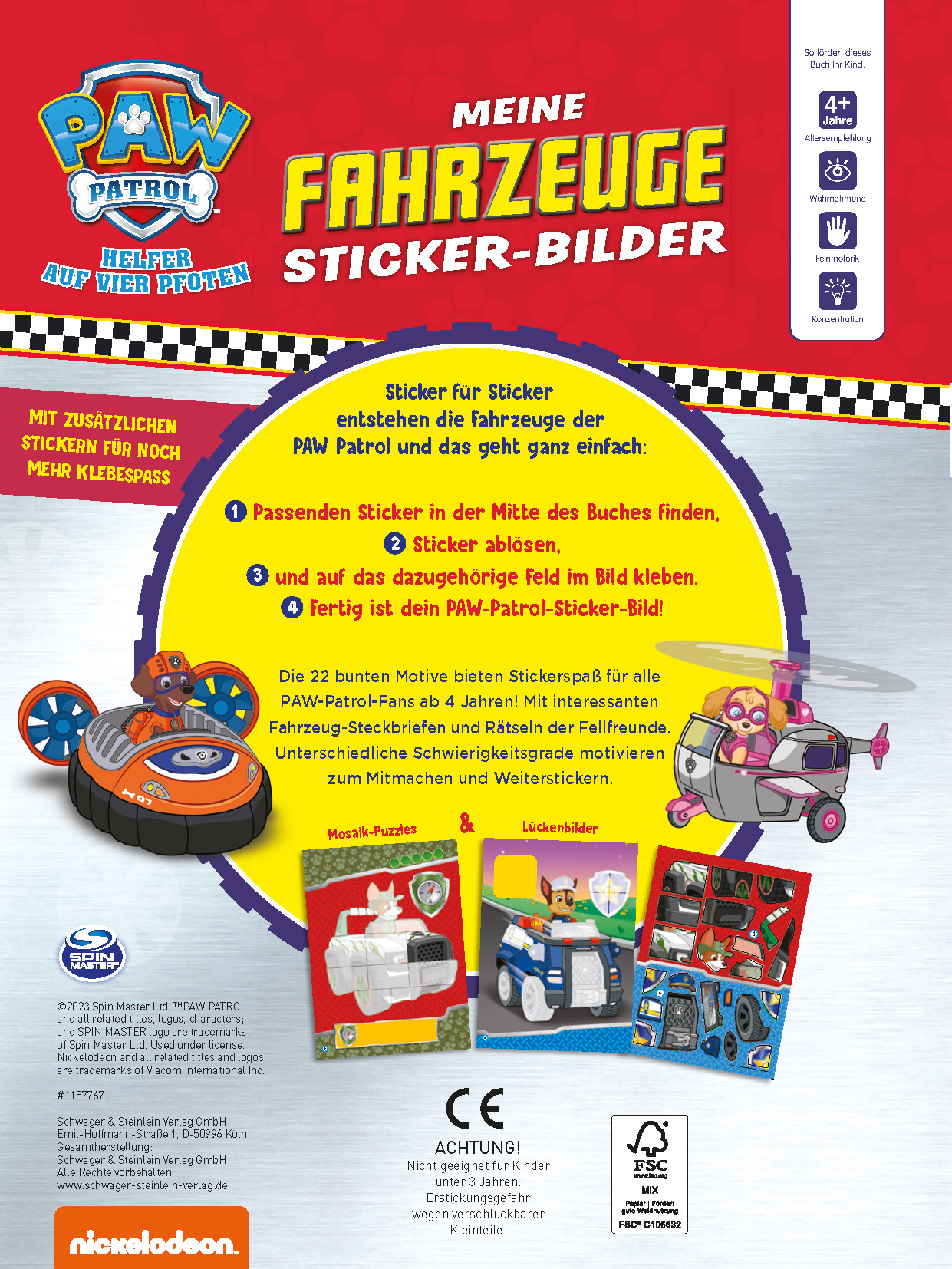 Die PAW Patrol ist immer bereit! Besonders wichtig für ihre spannenden Einsätze: ihre perfekt ausgestatteten Rettungsfahrzeuge. Hilf Chase, Rubble, Skye und Co., indem du ihre Fahrzeuge Sticker für Sticker zusammenbaust. Entscheide dich für Lückenbilder, in die du einzelne Bauteile wie Reifen oder Scheinwerfer einkleben kannst oder suche dir eins der kniffligen Mosaike heraus, die vom ersten bis zum letzten Mosaikstück zusammengestickert werden.