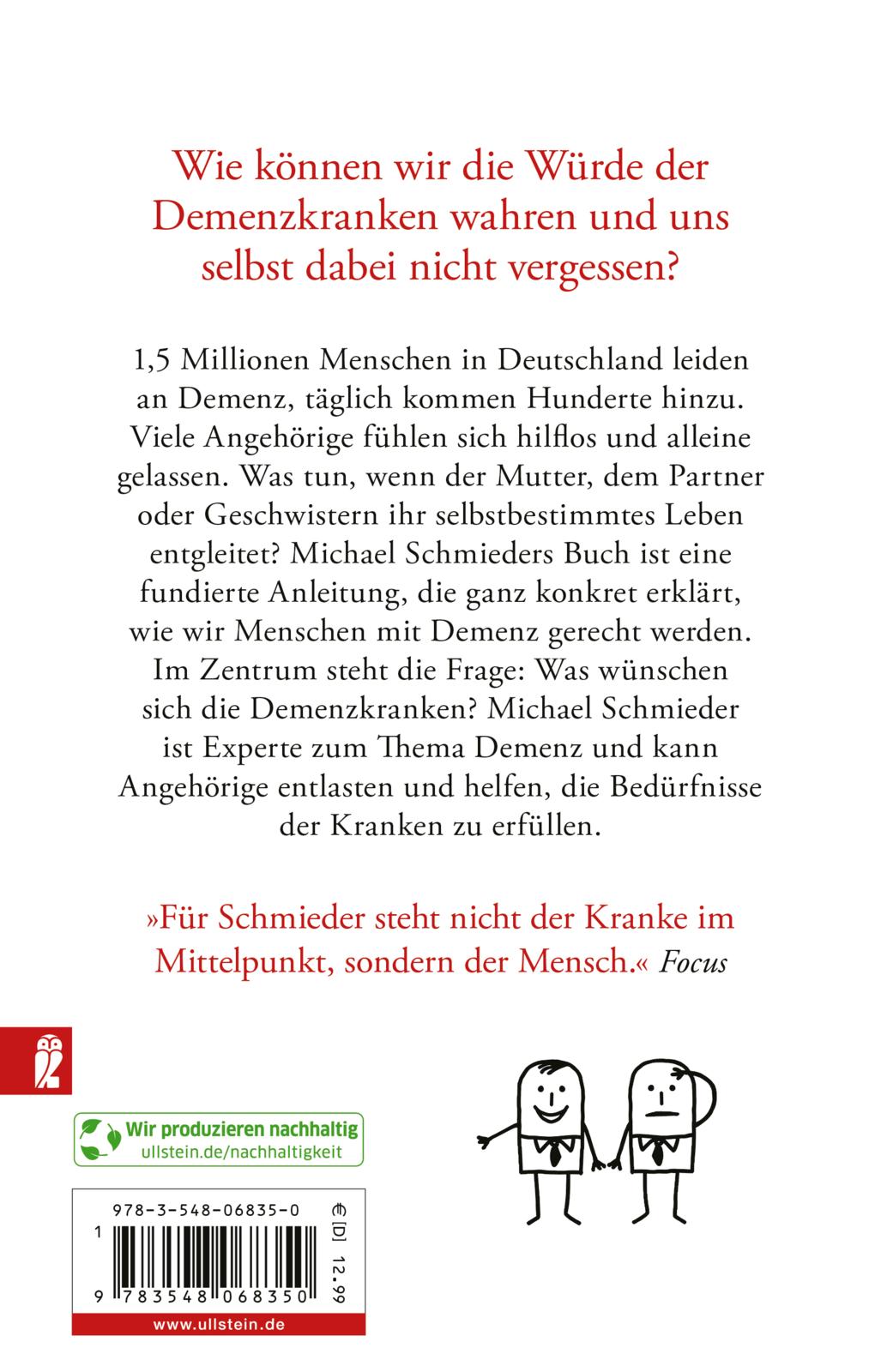 1,5 Millionen Menschen in Deutschland leiden an Demenz, täglich kommen Hunderte hinzu. Viele Angehörige fühlen sich hilflos und alleine gelassen. Was tun, wenn der Mutter, dem Partner oder Geschwistern ihr selbstbestimmtes Leben entgleitet? Michael Schmieders Buch ist eine fundierte Anleitung, die ganz konkret erklärt, wie wir Menschen mit Demenz gerecht werden. Im Zentrum steht die Frage: Was wünschen sich die Demenzkranken? Wie können wir verstehen, was ihnen wirklich guttut? Es ist für Angehörige und Pflegekräfte oft schwer, zu erkennen und zu verstehen, was Demenzkranke sich wünschen. Michael Schmieder ist Experte zum Thema Demenz und kann Angehörige entlasten und helfen, die Bedürfnisse der Kranken zu erfüllen. Ist die Haltung, mit der wir ihnen begegnen von Achtung und Sympathie geprägt, erschließt sich der Rest schon fast wie von selbst.