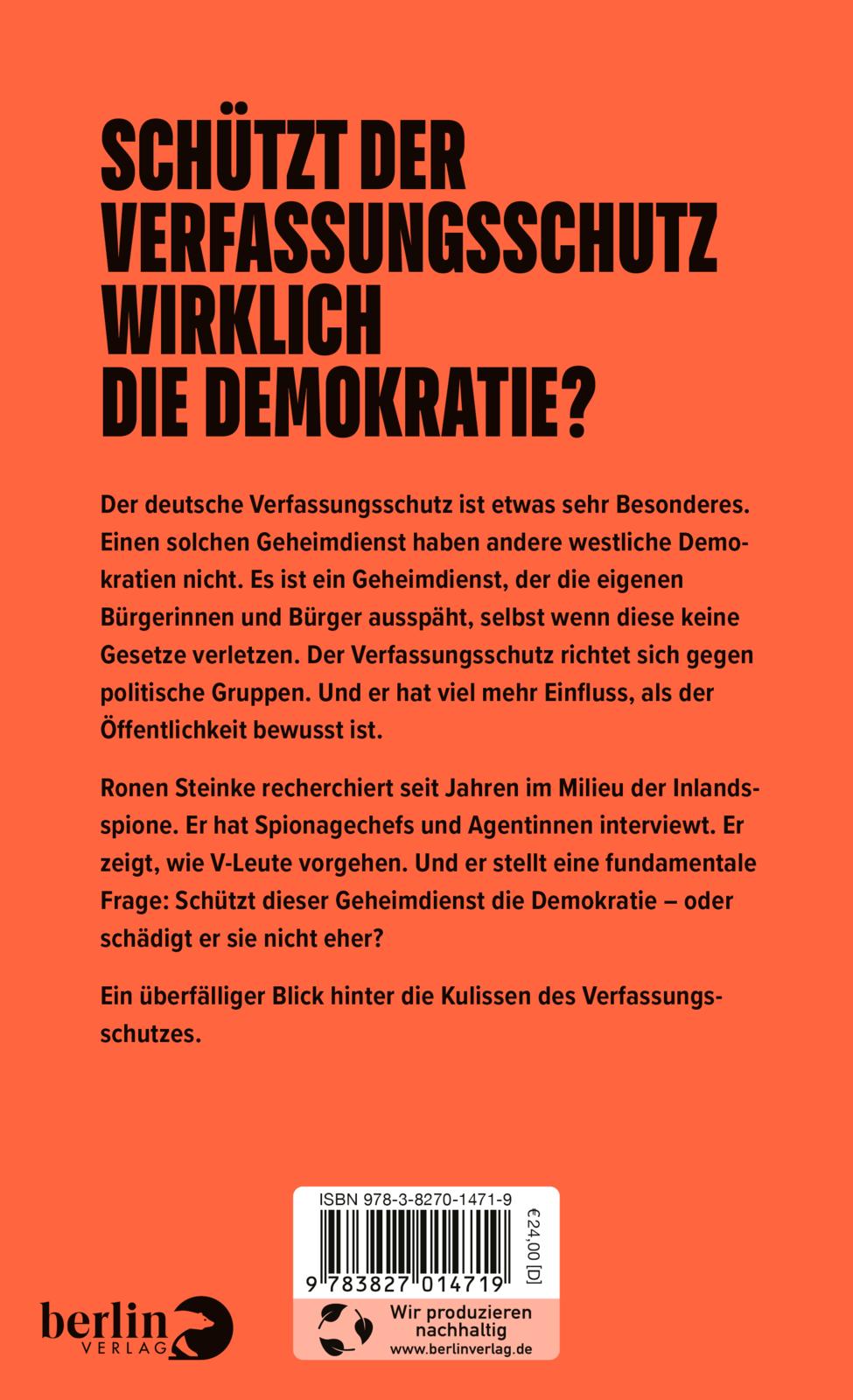 Ronen Steinke recherchiert seit Jahren im Milieu der Inlandsspione. Er hat Spionagechefs interviewt und Agentinnen bei der Arbeit begleitet. Er zeigt, wie V-Leute vorgehen. Und er stellt eine fundamentale Frage: Schützt dieser Geheimdienst die Demokratie – oder schädigt er sie nicht eher?