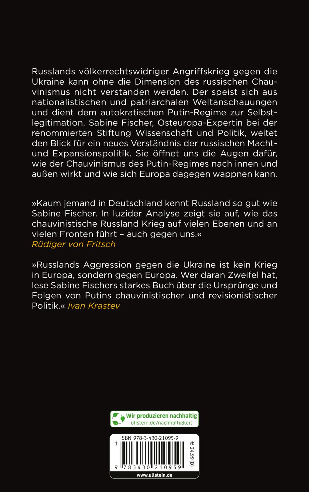 »Viele reden über Russland – Sabine Fischer kennt es von innen, besser als kaum jemand sonst in Deutschland. In luzider Analyse enthüllt sie den chauvinistischen Charakter seiner aggressiven Politik und seines Präsidenten. Wer Wladimir Putins zerstörerischen und selbstzerstörerischen Krieg verstehen will, muss dieses Buch lesen.« - Rüdiger von Fritsch